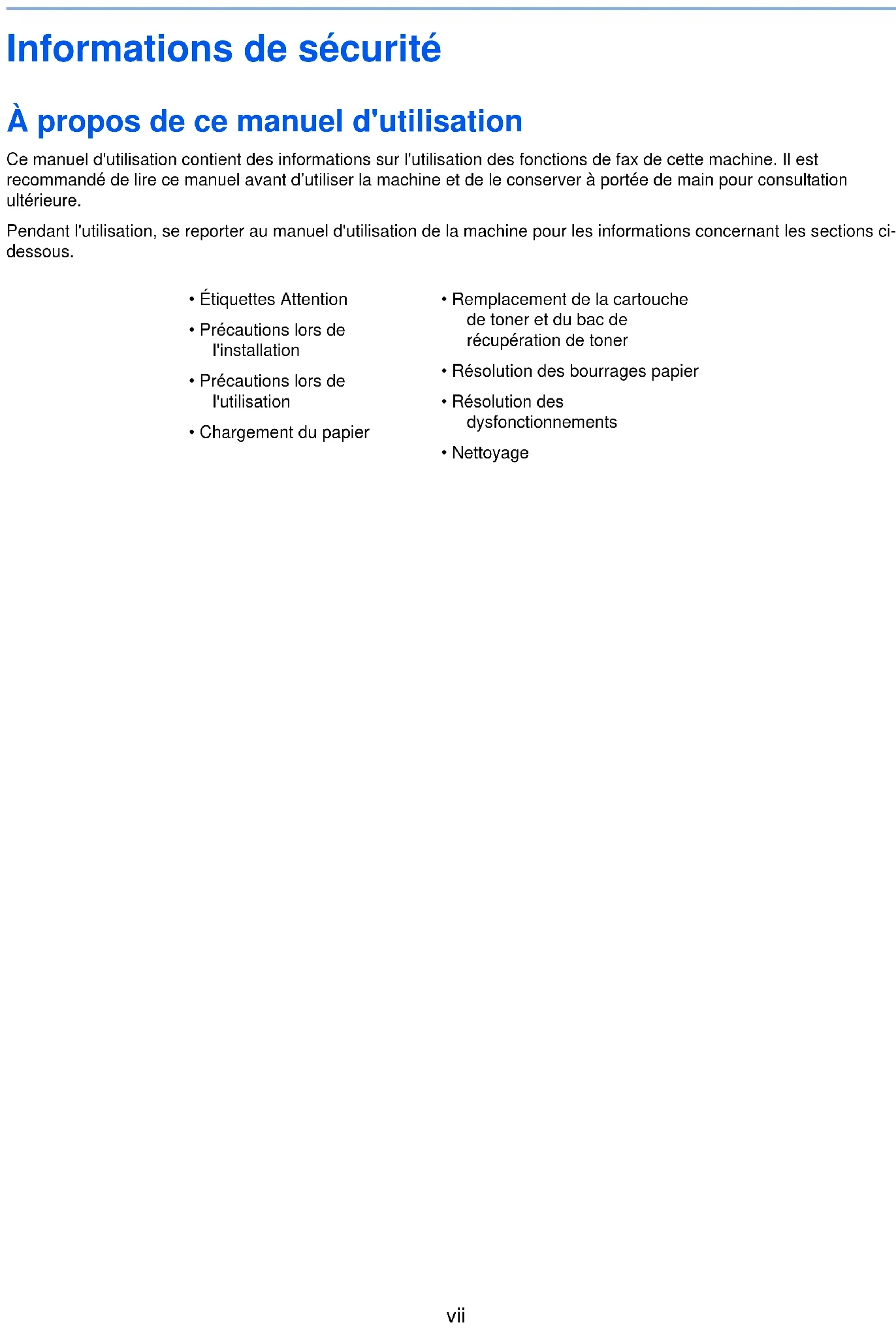 - Nettoyageviii Remarque d'ordre général Avis légal NOUS DÉCLINONS TOUTE RESPONSABILITÉ RELATIVE À LA PERTE, TOTALE OU PARTIELLE, DES DOCUMENTS REÇUS DÈS LORS QU'ELLE EST CAUSÉE PAR DES DOMMAGES AU FAX, UN MAUVAIS FONCTIONNEMENT, UNE MAUVAISE UTILISATION OU DES FACTEURS EXTERNES TELS QUE DES COUPURES D'ALIMENTATION ; OU À DES PERTES PUREMENT ÉCONOMIQUES OU DES PERTES DE PROFIT RÉSULTANT D'OPPORTUNITÉS MANQUÉES ATTRIBUABLES À DES APPELS OU À DES MESSAGES ENREGISTRÉS MANQUÉS. Marques et noms de produits