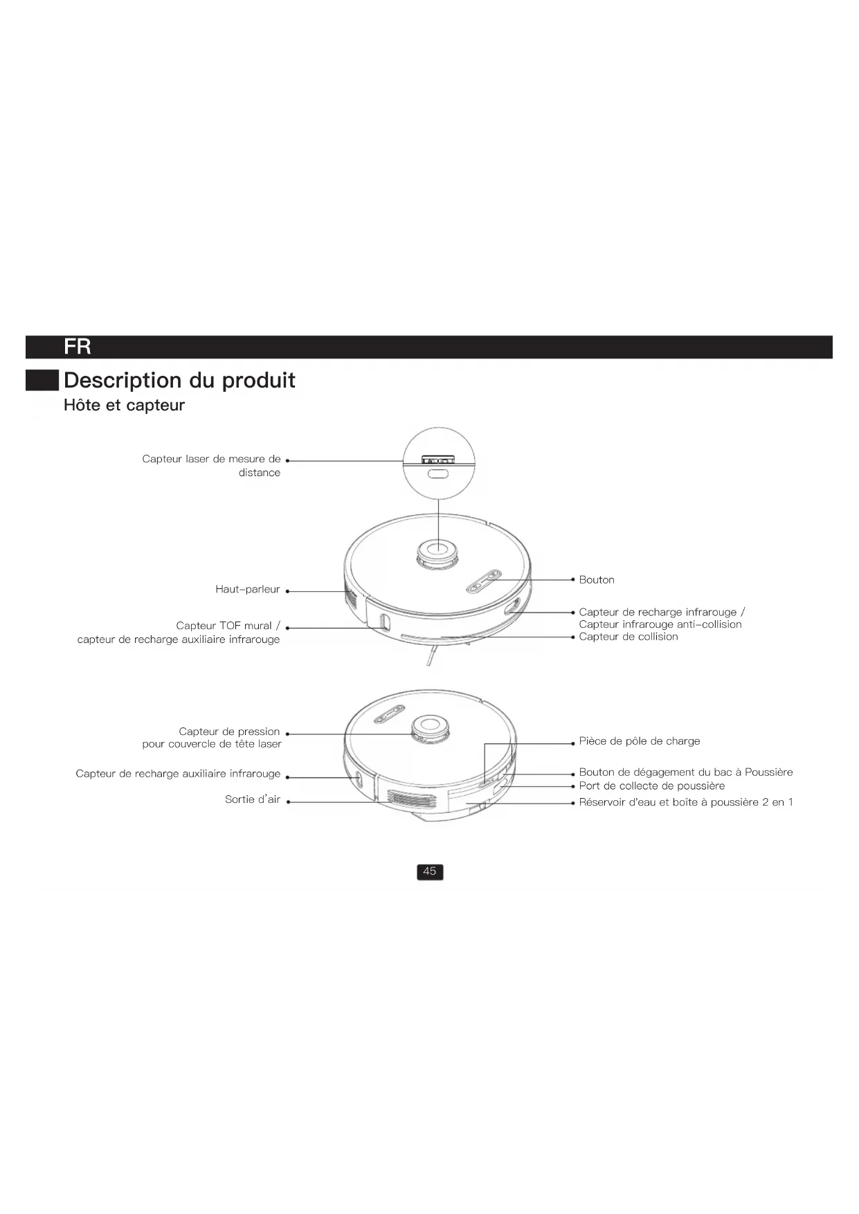 Capteur laser de mesure de distance Haut-parleur Bouton Capteur de recharge infrarouge / Capteur infrarouge anti-collision Capteur de collision Pièce de pôle de charge Bouton de dégagement du bac à Poussière Port de collecte de poussière Capteur TOF mural / capteur de recharge auxiliaire infrarouge Capteur de pression pour couvercle de tête laser Capteur de recharge auxiliaire infrarouge Sortie d’air Réservoir d'eau et boîte à poussière 2 en 146
