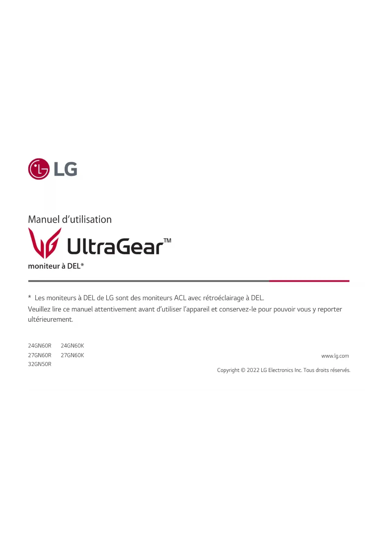 - Les moniteurs à DEL de LG sont des moniteurs ACL avec rétroéclairage à DEL. Veuillez lire ce manuel attentivement avant d’utiliser l’appareil et conservez-le pour pouvoir vous y reporter ultérieurement. 24GN60R 27GN60R 32GN50R 24GN60K 27GN60K www.lg.com Copyright © 2022 LG Electronics Inc. Tous droits réservés.moniteur à DEL* Manuel d’utilisation