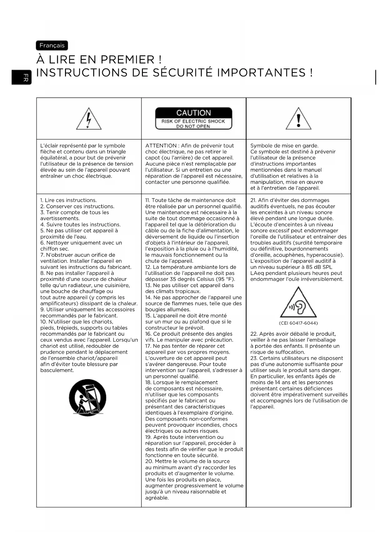 auditifs éventuels, ne pas écouter les enceintes à un niveau sonore élevé pendant une longue durée. L’écoute d’enceintes à un niveau sonore excessif peut endommager l’oreille de l’utilisateur et entraîner des troubles auditifs (surdité temporaire ou définitive, bourdonnements d’oreille, acouphènes, hyperacousie). L’exposition de l’appareil auditif à un niveau supérieur à 85 dB SPL LAeq pendant plusieurs heures peut endommager l’ouïe irréversiblement.