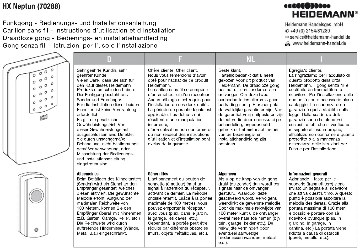 À l’actionnement de l’émetteur, un signal est envoyé au récepteur. Pour répéter le coup de sonnette, appuyez à nouveau sur le bouton de sonnette. La sonnerie ne retentit qu’une seule fois, même si vous maintenez le bouton de sonnette enfoncé. Mise en place des piles dans l’émetteur L’émetteur est alimenté par 1 pile 3 Volt Lithium CR2032 comprise dans la livraison et déjà mises en place. Il suffit d’enlever le film protecteur qui dépasse sur le côté de l’émetteur pour établir le contact électrique. Pour remplacer la pile, enlevez tout d’abord le couvercle au dos de l’émetteur en enfonçant avec précaution la barrette à l’aide d’un petit tournevis. Remplacez la pile. Vérifiez si la pile a été mise en place conformément à la polarité indiquée (+ = au dessus). Assemblez à nouveau la partie frontale et la partie arrière de l’émetteur. L’émetteur est alors prêt à l’emploi. Mise en place des piles dans le récepteur Faites glisser le couvercle du compartiment des piles (au dos de l’appareil) vers le bas et mettez les piles en place (pas comprises dans la livraison) 2 x 1,5 Volt LR14 / Baby. Respectez la polarité lors de la mise en place! Remettez le couvercle du compartiment des piles en place. Le récepteur est alors prêt à l’emploi. Fixation de l’émetteur Vous pouvez vous servir des deux trous aménagés sur le dos de l’émetteur comme gabarits pour marquer les trous de forage. Les chevilles et vis appropriées sont comprises dans la livraison. En alternative, l’émetteur peut être fixé à l’aide d’un socle à coller, également compris dans la livraison.Wichtig Durch Montieren des Senders auf weichmacherfreie PVC Türrahmen oder Metalloberflächen, wird die Reichweite eingeschränkt! Empfänger Befestigung Der Empfänger hat auf der Rückseite ein Befestigungsloch. Dadurch kann das Gerät an einer Schraube aufgehangen oder jederzeit beliebig in einen anderen Raum mitgenommen werden. Das Befestigungsmaterial (Dübel und Schraube) ist im Lieferumfang enthalten. Achten Sie bei der Montage darauf, dass zwischen Wand und Empfänger ein Abstand von ca. 3mm gelassen wird, damit das Gerät locker eingehangen werden kann. Melodienauswahl Der Melodienregler befindet sich im Sender auf der rechten Seite über der Batterie und ist mit einem “S” markiert. Durch drücken auf den Regler ändert sich die Melodie gemäß der unten aufgeführten Liste. Einstellmöglichkeiten: