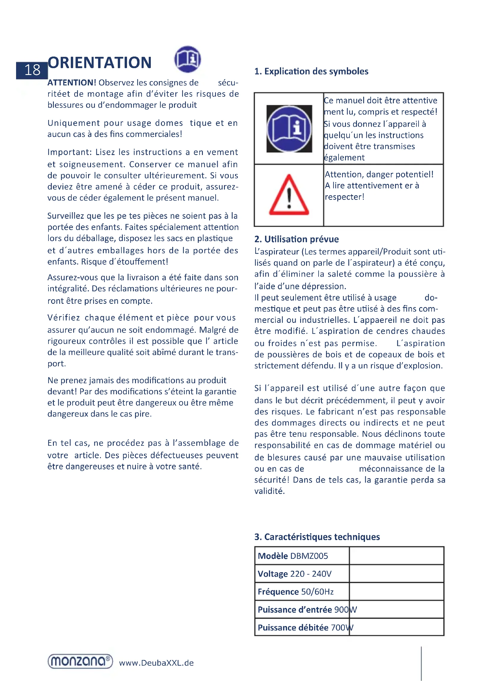 DBMZ005 - Aspirateur Monzana - Notice d'utilisation et mode d'emploi gratuit