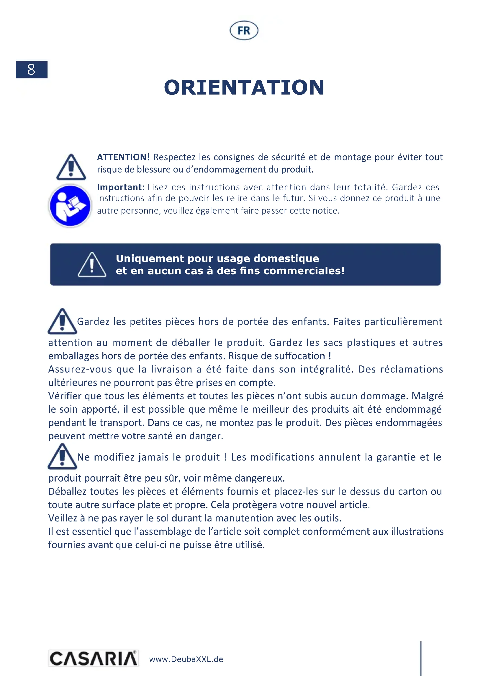 Uniquement pour usage domestique et en aucun cas à des ns commerciales!9 www.DeubaXXL.de Généralités Nous recommandons un min. de deux personnes pour la construction de meubles de jardin plus volumineux Jetez les matériaux d'emballage conformément à la réglementation locale. Le recyclage est important ! À la fin de la durée de vie de votre article, les matières premières précieuses sont éliminées de manière appropriée afin de permettre leur recyclage Si vous avez acheté des coussins ou des revêtements avec ce produit, veuillez noter que leur lavage ôte le revêtement hydrofuge du tissu. Votre pressing local peut vous conseiller sur les possibilités d'imprégnation. Important : Ne vous mettez pas debout ou ne vous asseyez pas sur les tables. Gardez les pièces de petite taille hors de la portée des enfants. De même, en particulier lors du déballage, veillez à garder les sacs en plastique et autres emballages hors de la portée des enfants ! Risque d’étouffement ! Conseil pour l'élimination des taches : Évitez le lavage en machine ! Essayez d'abord de nettoyer la tache avec de l'eau savonneuse tiède. N'utilisez pas de brosses dures ou de détergents agressifs qui pourraient endommager la couche protectrice hydrofuge du coussin ou du revêtement. Instructions de montage Veuillez noter que les vis sont d'abord insérées à la main et serrées légèrement, de sorte que la vis trouve prise et relie les éléments de manière lâche. ScLes vis ne doivent pas être serrées tant que tous les éléments ne sont pas fixés de cette manière. Le serrage ultérieur des vis peut compenser les petites déviations des trous percés ou des soudures qui peuvent se produire lorsque les produits sont fabriqués artisanalement. N'utilisez pas d'outils électriques pour assembler ce produit. La puissance importante d'un outil électrique peut provoquer un serrage excessif des vis et elles n’ont alors plus de prise.10 www.DeubaXXL.de Insérez toujours la clé hexagonale dans le renfoncement prévu. Assurez-vous que ce produit est entièrement assemblé avant de l’utiliser, comme indiqué sur la photo. Assurez-vous que tous les pieds sont bien en contact avec le sol et que votre produit est placé en toute sécurité sur le sol. Vérifiez que toutes les vis et tous les boulons sont bien serrés et faites ensuite ce contrôle de manière régulière. Tenez les enfants à l'écart au moment de l'assemblage, risque de blessure! Rotin Votre nouveau produit en tresse de rotin dispose d'une structure en acier / aluminium prétraité. La structure a été prétraitée et revêtue de poudre pour une longévité maximale. Déballez toutes les pièces et tous les éléments du kit et placez les composants sur une surface propre. Veillez à ne pas rayer le sol. Ce produit ne doit être placé que sur des surfaces stables et de planes. Nous vous recommandons de monter le produit à l'endroit où il sera utilisé ultérieurement. Les produits en rotin sont conçus pour être utilisés avec des coussins ou revêtements appropriés. Leur usage sans coussins ou revêtements peut causer des dommages. Protégez votre produit contre la pluie et les intempéries. En période de gel et pendant l’hiver, vous devez ranger votre produit au sec et à l’abri. Nous vous recommandons d'utiliser un couvercle de protection approprié ! Vous pouvez vous en procurer un dans notre boutique en ligne Si vous n'effectuez pas un entretien régulier, vous diminuerez considérablement la durée de vie de votre produit. Nous n'assumons aucune responsabilité quant aux dommages indirects résultant d'un manque d'entretien et de soins.11 www.DeubaXXL.de ISTRUZIONI ATTENZIONE! Osservare le istruzioni di sicurezza e di montaggio per evitare il rischio di lesioni o danni al prodotto. Importante: Leggere le istruzioni completamente e in maniera accurata. Conservare questo manuale per consulti futuri. Se un giorno venderai il prodotto, assicurati di consegnare anche questo manuale. Tenere le parti più piccole al di fuori dalla portata dei bambini. Inoltre, soprattutto all’apertura del pacco, assicurati di tenere buste di plastica e materiali per l’imballaggio fuori dalla portata dei bambini! Pericolo di soffocamento! Controllare che la consegna sia completa. Reclami successivi alla consegna non possono essere accettati. Controllare tutti gli elementi e le parti non presentino danni. Nonostante controlli accurati, può accadere che anche i migliori prodotti vengano danneggiati lungo il percorso durante la consegna. In tal caso, non testare e mettere in funzione il prodotto. Le parti difettose possono causare pericoli e danni alla salute. Non apportare mai modifiche al prodotto! Le modifiche invalideranno la garanzia e potrebbero rendere il prodotto non sicuro o, nel peggiore dei casi pericoloso. Disimballare tutte le parti e gli elementi del kit e posizionare i componenti sopra il cartone o altra superficie pulita. Questo protegge il tuo nuovo prodotto. Inoltre, fare attenzione a non graffiare il pavimento quando si lavora con gli strumenti. Assicurarsi che questo prodotto sia completamente assemblato prima dell'uso, come mostrato nell'illustrazione.
