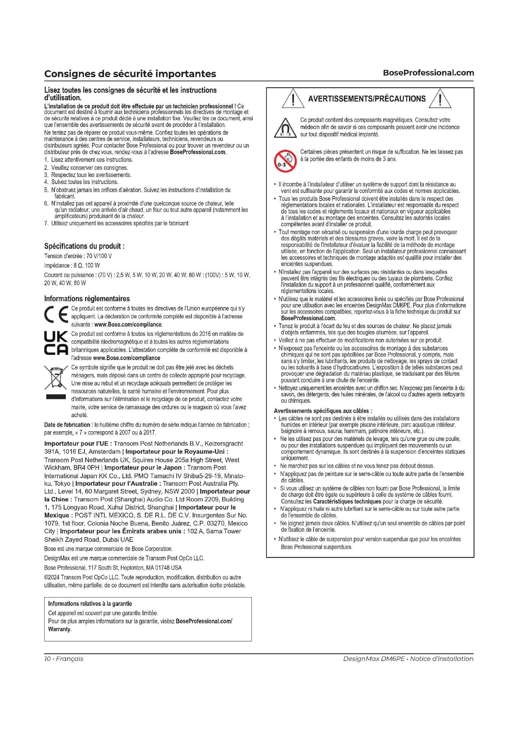 Informations réglementaires Ce produit est conforme à toutes les directives de l’Union européenne qui s’y appliquent. La déclaration de conformité complète est disponible à l’adresse suivante : www.Bose.com/compliance. Ce produit est conforme à toutes les réglementations de 2016 en matière de compatibilité électromagnétique et à toutes les autres réglementations britanniques applicables. L’attestation complète de conformité est disponible à l’adresse www.Bose.com/compliance Ce symbole signie que le produit ne doit pas être jeté avec les déchets ménagers, mais déposé dans un centre de collecte approprié pour recyclage. Une mise au rebut et un recyclage adéquats permettent de protéger les ressources naturelles, la santé humaine et l’environnement. Pour plus d’informations sur l’élimination et le recyclage de ce produit, contactez votre mairie, votre service de ramassage des ordures ou le magasin où vous l’avez acheté. Date de fabrication : le huitième chiffre du numéro de série indique l’année de fabrication ; par exemple, « 7 » correspond à 2007 ou à 2017. Importateur pour l’UE : Transom Post Netherlands B.V., Keizersgracht 391A, 1016 EJ, Amsterdam | Importateur pour le Royaume-Uni : Transom Post Netherlands UK, Squires House 205a High Street, West Wickham, BR4 0PH | Importateur pour le Japon : Transom Post International Japan KK Co., Ltd. PMO Tamachi IV Shiba5-29-19, Minato- ku, Tokyo | Importateur pour l’Australie : Transom Post Australia Pty. Ltd., Level 14, 60 Margaret Street, Sydney, NSW 2000 | Importateur pour la Chine : Transom Post (Shanghai) Audio Co. Ltd Room 2209, Building 1, 175 Longyao Road, Xuhui District, Shanghai | Importateur pour le Mexique : POST INTL MEXICO, S. DE R.L. DE C.V. Insurgentes Sur No. 1079, 1st oor, Colonia Noche Buena, Benito Juárez, C.P. 03270, Mexico City | Importateur pour les Émirats arabes unis : 102 A, Sama Tower Sheikh Zayed Road, Dubai UAE Bose est une marque commerciale de Bose Corporation. DesignMax est une marque commerciale de Transom Post OpCo LLC. Bose Professional, 117 South St, Hopkinton, MA 01748 USA ©2024 Transom Post OpCo LLC. Toute reproduction, modication, distribution ou autre utilisation, même partielle, de ce document est interdite sans autorisation écrite préalable. Informations relatives à la garantie Cet appareil est couvert par une garantie limitée. Pour de plus amples informations sur la garantie, visitez BoseProfessional.com/ Warranty. Spécications du produit : Tension d’entrée : 70 V/100 V Impédance : 8 Ω, 100 W Courant ou puissance : (70 V) : 2,5 W, 5 W, 10 W, 20 W, 40 W, 80 W ; (100V) : 5 W, 10 W, 20 W, 40 W, 80 W