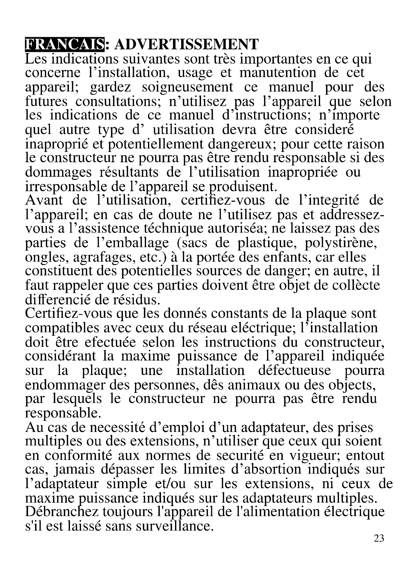 - Zur Reinigung des Kochfeldes (4) und des Gehäuses (3) kann heißes, aber nicht kochendes Wasser und normales, alkalifreies Spülmittel verwendet werden.23 FRANCAIS: ADVERTISSEMENT Les indications suivantes sont très importantes en ce qui concerne l’installation, usage et manutention de cet appareil; gardez soigneusement ce manuel pour des futures consultations; n’utilisez pas l’appareil que selon les indications de ce manuel d’instructions; n’importe quel autre type d’ utilisation devra être consideré inaproprié et potentiellement dangereux; pour cette raison le constructeur ne pourra pas être rendu responsable si des dommages résultants de l’utilisation inapropriée ou irresponsable de l’appareil se produisent. Avant de l’utilisation, certifiez-vous de l’integrité de l’appareil; en cas de doute ne l’utilisez pas et addressez- vous a l’assistence téchnique autoriséa; ne laissez pas des parties de l’emballage (sacs de plastique, polystirène, ongles, agrafages, etc.) à la portée des enfants, car elles constituent des potentielles sources de danger; en autre, il faut rappeler que ces parties doivent être objet de collècte differencié de résidus. Certifiez-vous que les donnés constants de la plaque sont compatibles avec ceux du réseau eléctrique; l’installation doit être efectuée selon les instructions du constructeur, considérant la maxime puissance de l’appareil indiquée sur la plaque; une installation défectueuse pourra endommager des personnes, dês animaux ou des objects, par lesquels le constructeur ne pourra pas être rendu responsable. Au cas de necessité d’emploi d’un adaptateur, des prises multiples ou des extensions, n’utiliser que ceux qui soient en conformité aux normes de securité en vigueur; entout cas, jamais dépasser les limites d’absortion indiqués sur l’adaptateur simple et/ou sur les extensions, ni ceux de maxime puissance indiqués sur les adaptateurs multiples. Débranchez toujours l'appareil de l'alimentation électrique s'il est laissé sans surveillance.24 Ne pas laisser l’appareil inutilemente connecté a la prise eléctrique; c’est toujours mieux de le déconnecter quand il n’est pas à l’use. Pour le nettoyage déconnectez la fiche du secteur électrique. Quand l’appareil soit hors usage et ait été décidé qu’il ne sera pas reparé, on reccomande son inutilisation, en coupant son câble d’alimentation. - Ne pas approcher le câble d’alimentation d’objects coupants ou de surfaces chaudes, et ne pas tirer sur le cordon d’alimentation pour le débrancher de la prise. Ne le laissez pas pendre du plan de travail où un enfant pourrait le tenir. - Ne pas utiliser l’appareil si le câble d’alimentation ou la fiche de connéction eléctrique sont endommagés, ou encore en cas de court-circuits; dans ce cas là, apporter l’appareil a un centre d’assistence autorisé. - L’appareil n’est pas indiqué pour être exposé à des conditions météorologiques défavorables (pluie, vent, humidité, la glace, etc.); Gardez-le dans un endroit sec. Jamais opérer ou même toucher l’appareil avec les mains mouillées ou les pieds nus. - Ce produit ne doit pas être utilisé par les enfants, même s'ils ont plus de 8 ans. - Cet appareil peut être utilisé par des personnes ayant des capacités physiques, sensorielles ou mentales réduites, ou qui manquent d'expérience ou de connaissances, si elles ont été correctement supervisées ou ont reçu des instructions pour utiliser cet appareil en toute sécurité. - Les enfants ne doivent pas jouer avec cet appareil. - Gardez l’appareil et le câble d’alimentation hors la portée des enfants agés de moins de 8 ans. Si le câble d'alimentation est endommagé ou en cas de panne et / ou de dysfonctionnement, ne modifiez pas l'appareil. Toute réparation doit être effectuée par le25 fabricant ou par son service d'assistance technique ou, en tout cas, par une personne possédant une qualification similaire, afin d'éviter tout risque. Le non-respect de ce qui précède peut compromettre la sécurité de l'appareil et invalider les conditions de la garantie. ATTENTION: Cet appareil comporte une fonction de chauffage. Quelques surfaces, même si non la plaque elle même, pourront atteindre des températures élevées. Étant donné que la sensibilité à la température diffère de personne à personne, cet appareil devrà être usé avec PRUDENCE. Placez l’appareil sur des surfaces adéhrentes et préparées pour cet effet, et utilisez les mésures de protection contre la chaleur conseillées. - Cet appareil est destiné à être utilisé dans les ménages et des applications similaires: les cuisines du personnel dans les magasins, bureaux et autres environnements de travail, pour les clients dans les hôtels, motels et autres environnements de type résidentiel, de type lit et petit- déjeuner, hébergement. - L’appareil n’est pas conçu pour être utilisé avec une minuterie extérieure ou un commande à distance. - N’utiliser que des accéssoires e pièces d’origine. - Avant chaque utilisation, effectuez le cordon d'alimentation. Ne soumettez pas le produit à des chocs susceptibles de l'endommager. - Tenir l’appareil à l’écart des environnements où il peut y avoir des gaz, vapeurs, des substances inflammables ou explosives.