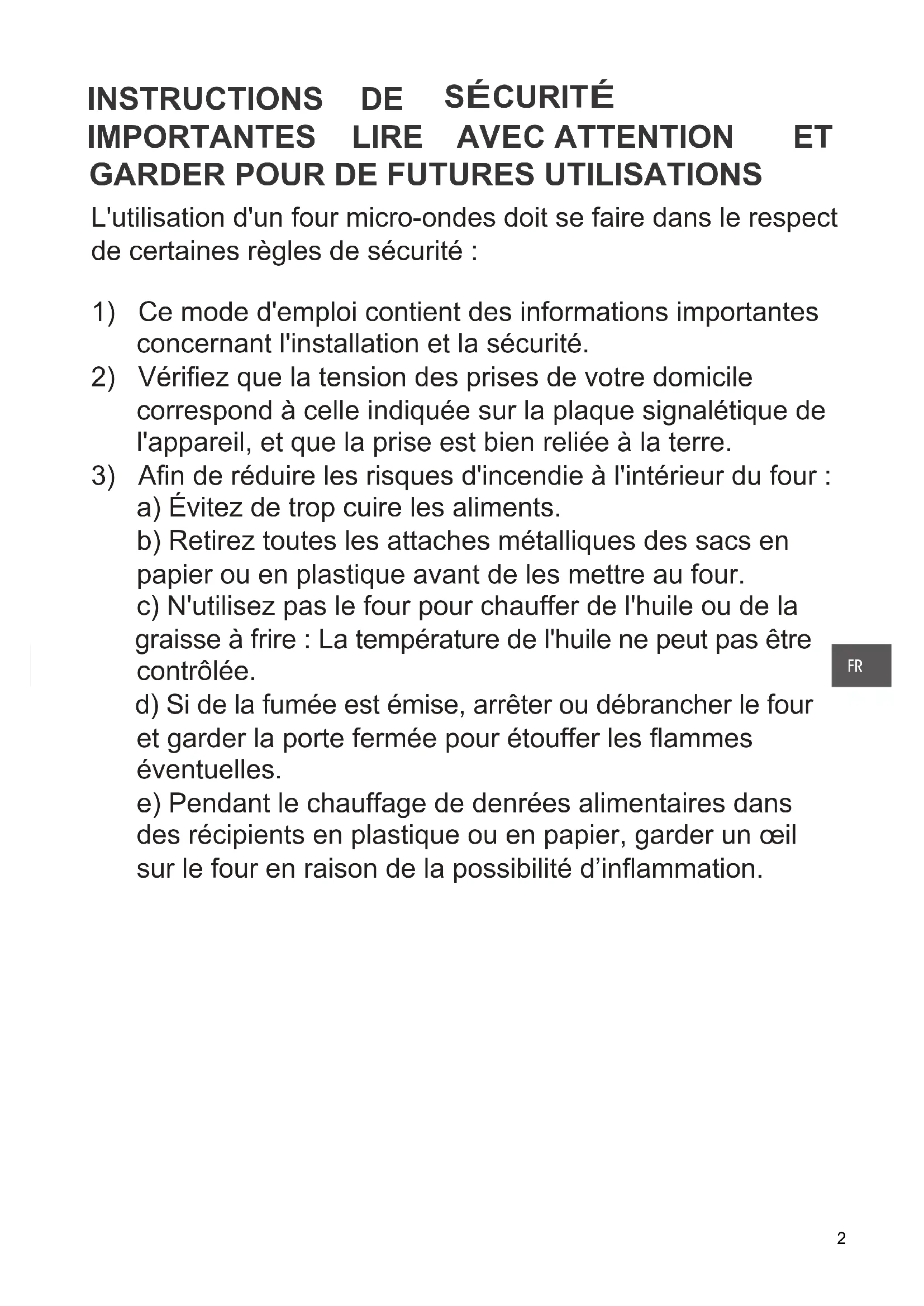 a) Évitez de trop cuire les aliments. b) Retirez toutes les attaches métalliques des sacs en papier ou en plastique avant de les mettre au four. c) N'utilisez pas le four pour chauffer de l'huile ou de la graisse à frire : La température de l'huile ne peut pas être contrôlée. d) Si de la fumée est émise, arrêter ou débrancher le four et garder la porte fermée pour étouffer les flammes éventuelles. e) Pendant le chauffage de denrées alimentaires dans des récipients en plastique ou en papier, garder un sur le four en raison de la possibilité d’inflammation.
