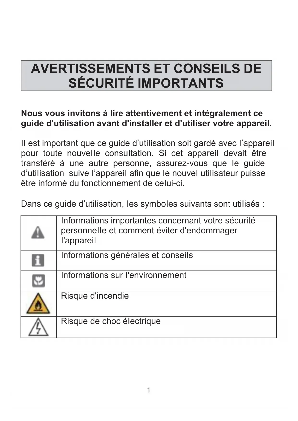 Fridge-freezer Guide d’utilisation -Instruction BookletNous vous invitons à lire attentivement et intégralement ce guide d'utilisation avant d'installer et d'utiliser votre appareil. II est important que ce guide d’utiIisation soit gardé avec I’appareiI pour toute nouveIIe consuItation. Si cet appareiI devait être transféré à une autre personne, assurez-vous que Ie guide d’utiIisation suive I’appareiI afin que Ie nouveI utiIisateur puisse être informé du fonctionnement de ceIui-ci. Dans ce guide d’utiIisation, Ies symboIes suivants sont utiIisés : Informations importantes concernant votre sécurité personneIIe et comment éviter d'endommager I'appareiI Informations généraIes et conseiIs Informations sur I'environnement Risque d'incendie Risque de choc éIectrique