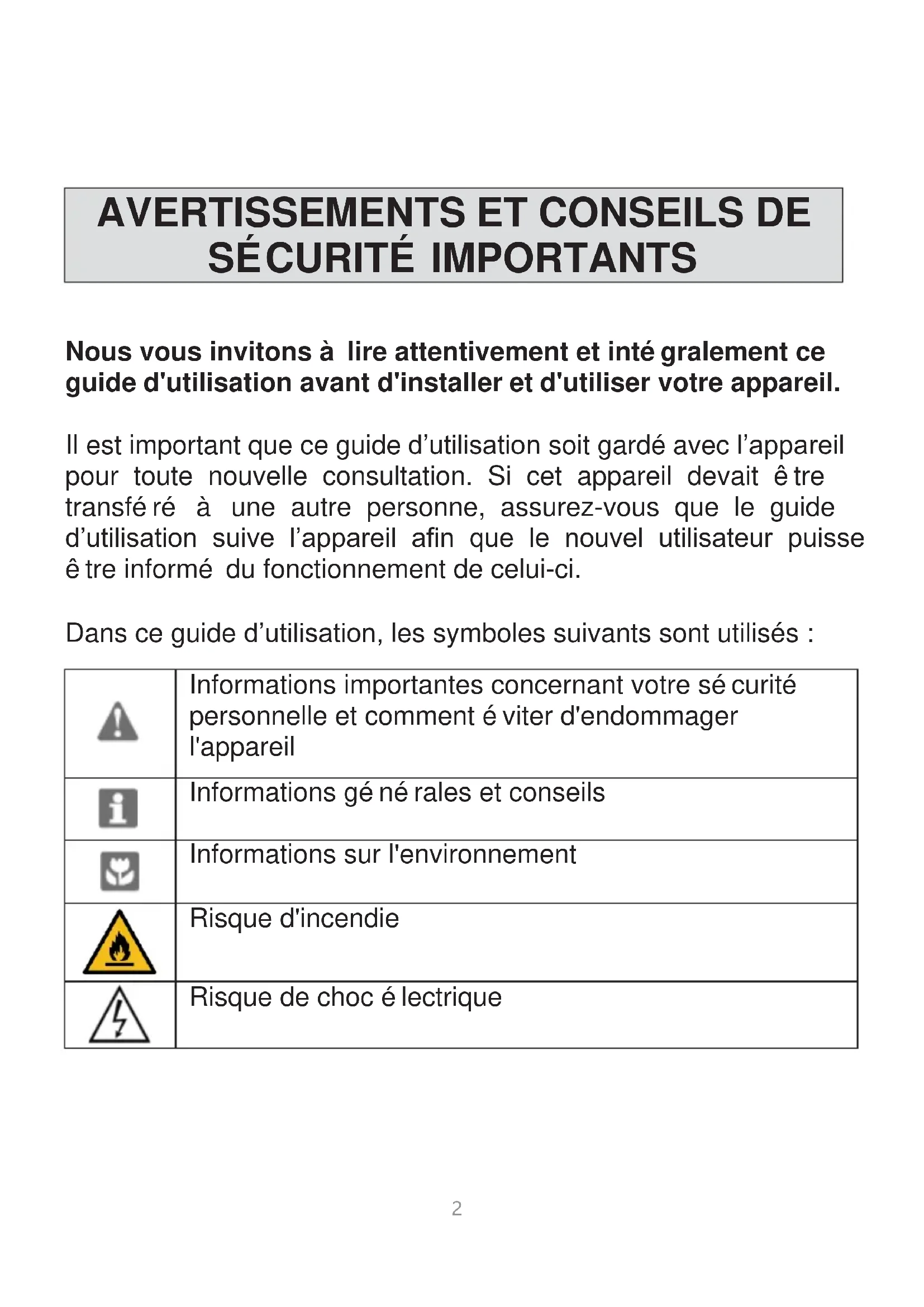 Nous vous invitons à lire attentivement et intégralement ce guide d'utilisation avant d'installer et d'utiliser votre appareil. Il est important que ce guide d’utilisation soit gardé avec l’appareil pour toute nouvelle consultation. Si cet appareil devait être transféré à une autre personne, assurez-vous que le guide d’utilisation suive l’appareil afin que le nouvel utilisateur puisse être informé du fonctionnement de celui-ci. Dans ce guide d’utilisation, les symboles suivants sont utilisés :