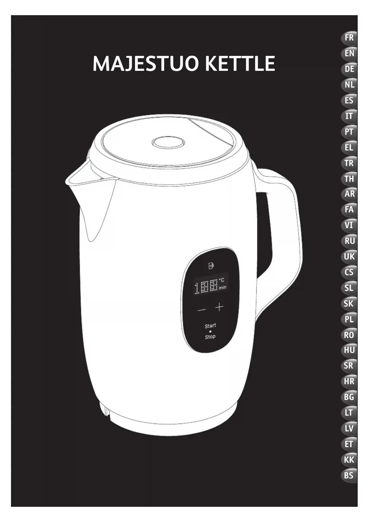 MAJESTUO KETTLE1 Lisez attentivement les instructions avant d’utiliser votre nouvel appareil pour la première fois: ce produit a été conçu pour un usage domestique et à l’intérieur seulement. En cas d’utilisation commerciale, inappropriée ou non conforme au mode d’emploi, le fabricant décline toute responsabilité et la garantie ne s’applique pas.