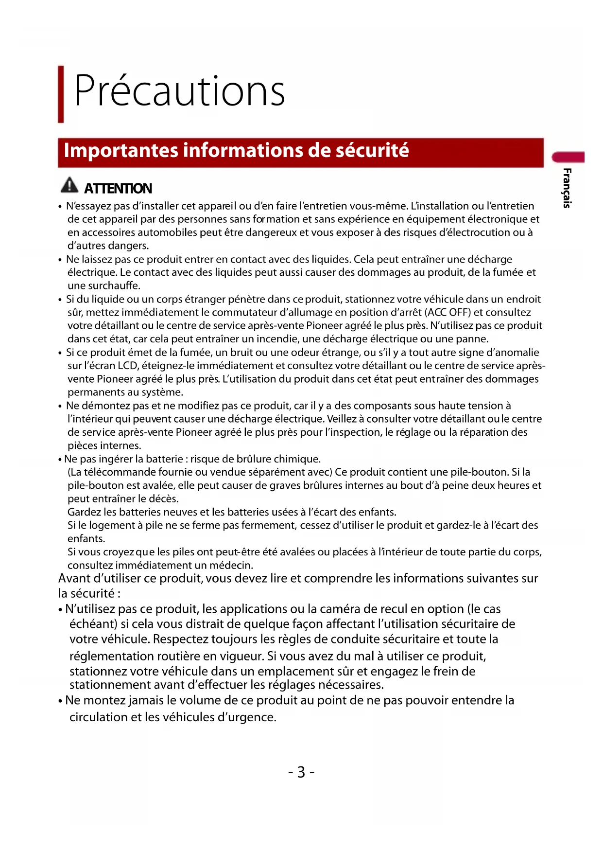 - Ne démontez pas et ne modifiez pas ce produit, car il y a des composants sous haute tension à l’intérieur qui peuvent causer une décharge électrique. Veillez à consulter votre détaillant ou le centre de service après-vente Pioneer agréé le plus près pour l’inspection, le réglage ou la réparation des pièces internes.• Ne pas ingérer la batterie : risque de brûlure chimique.(La télécommande fournie ou vendue séparément avec) Ce produit contient une pile-bouton. Si la pile-bouton est avalée, elle peut causer de graves brûlures internes au bout d’à peine deux heures et peut entraîner le décès.Gardez les batteries neuves et les batteries usées à l’écart des enfants. Si le logement à pile ne se ferme pas fermement, cessez d’utiliser le produit et gardez-le à l’écart des enfants. Si vous croyez que les piles ont peut-être été avalées ou placées à l’intérieur de toute partie du corps, consultez immédiatement un médecin. Avant d’utiliser ce produit, vous devez lire et comprendre les informations suivantes sur la sécurité :