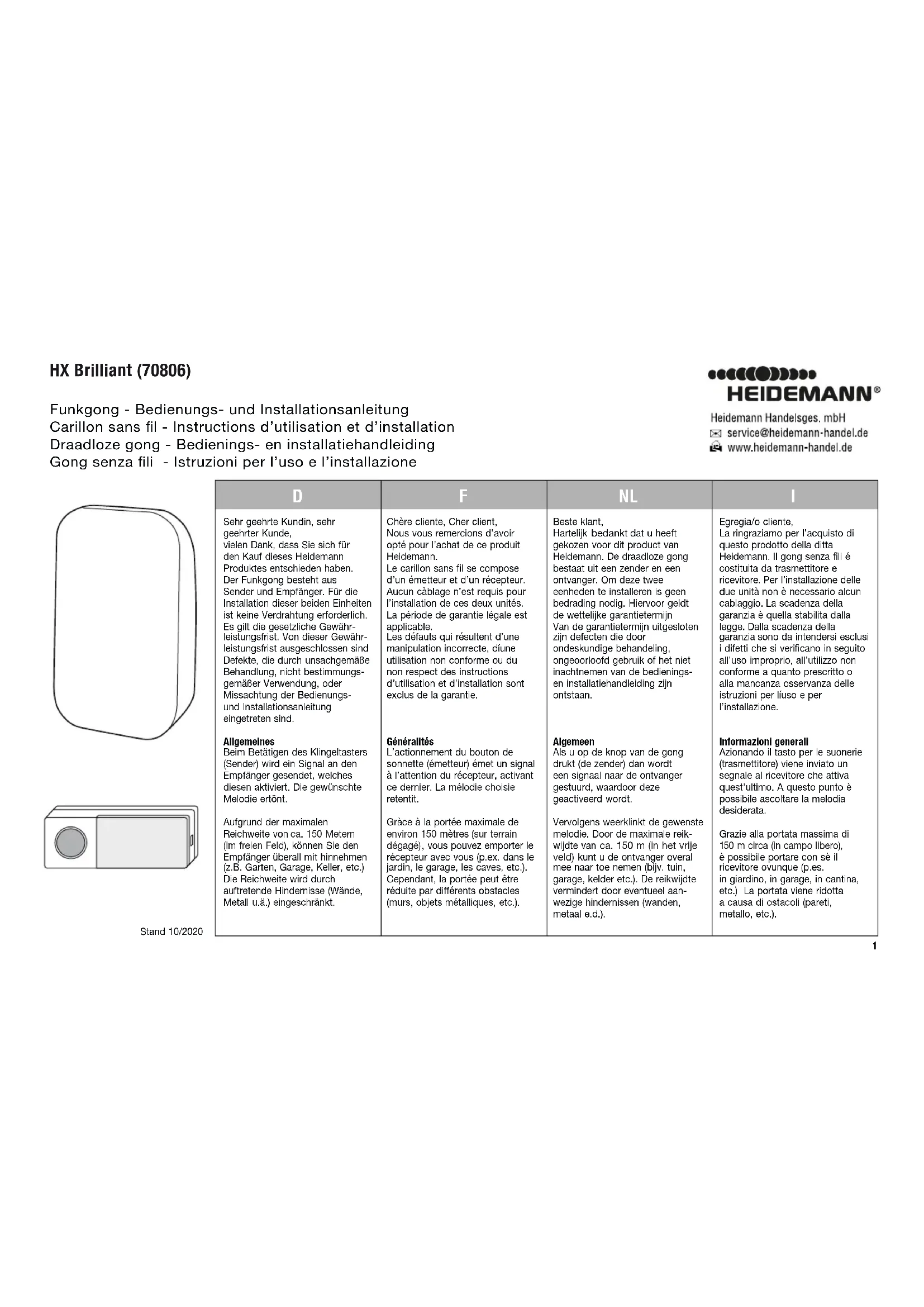 è possibile portare con sè il ricevitore ovunque (p.es. in giardino, in garage, in cantina, etc.) La portata viene ridotta a causa di ostacoli (pareti, metallo, etc.). Chère cliente, Cher client, Nous vous remercions d’avoir opté pour l’achat de ce produit Heidemann. Le carillon sans l se compose d’un émetteur et d’un récepteur. Aucun càblage n’est requis pour l’installation de ces deux unités. La période de garantie légale est applicable. Les défauts qui résultent d’une manipulation incorrecte, díune utilisation non conforme ou du non respect des instructions d’utilisation et d’installation sont exclus de la garantie. Généralités L’actionnement du bouton de sonnette (émetteur) émet un signal à l’attention du récepteur, activant ce dernier. La mélodie choisie retentit. Gràce à la portée maximale de environ 150 mètres (sur terrain dégagé) , vous pouvez emporter le récepteur avec vous (p.ex. dans le jardin, le garage, les caves, etc.). Cependant, la portée peut être réduite par différents obstacles (murs, objets métalliques, etc.). Stand 10/2020 1NLFD