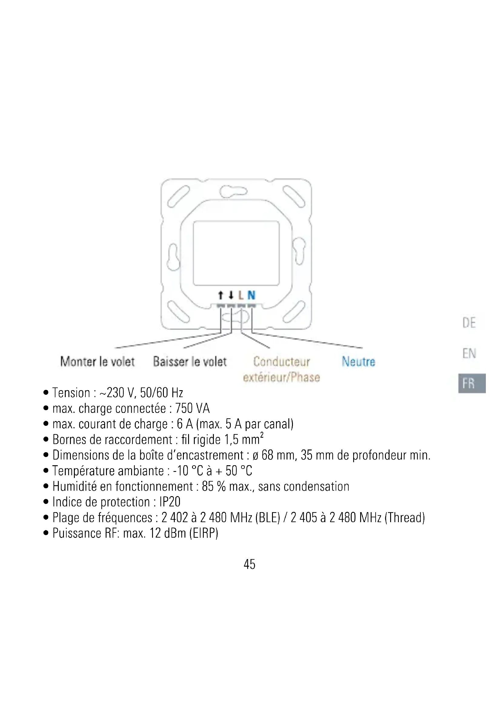 - Puissance RF: max. 12 dBm (EIRP)46 47 Prise en main Le branchement, l’installation et la configuration d’Eve Shutter Switch doivent être eectués par un électricien qualifié. Avant de procéder à l’installation, vérifiez que le circuit n’est pas alimenté en électricité ! Eve Shutter Switch permet de commuter directement des charges électriques permanentes dont la tension d’alimentation est d‘environ 230 V. Eve Shutter Switch est conçu pour un usage domestique et pour les installations fixes de même nature. Avant l’installation, vérifiez que ce produit est adapté à l’usage voulu en consultant les données techniques et les conditions de fonctionnement. Eve Shutter Switch ne doit pas être utilisé avec des dispositifs médicaux ou d’autres appareils susceptibles de mettre en danger la vie de personnes ou d’animaux, ou de causer des dégâts matériels.