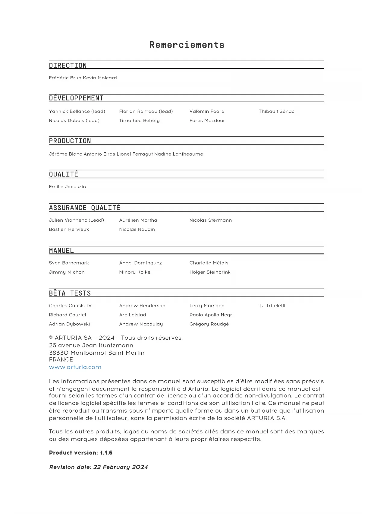 logiciel selon les termes et conditions du présent contrat. Vous n'êtes pas autorisé à louer ou prêter ce logiciel, ni à le concéder sous licence. L'utilisation du logiciel cédé en réseau est illégale si celle-ci rend possible l’utilisation multiple et simultanée du programme. Vous êtes autorisé à installer une copie de sauvegarde du logiciel qui ne sera pas employée à d'autres fins que le stockage. En dehors de cette énumération, le présent contrat ne vous concède aucun autre droit d'utilisation du logiciel. Arturia se réserve tous les droits qui n'ont pas été expressément accordés.