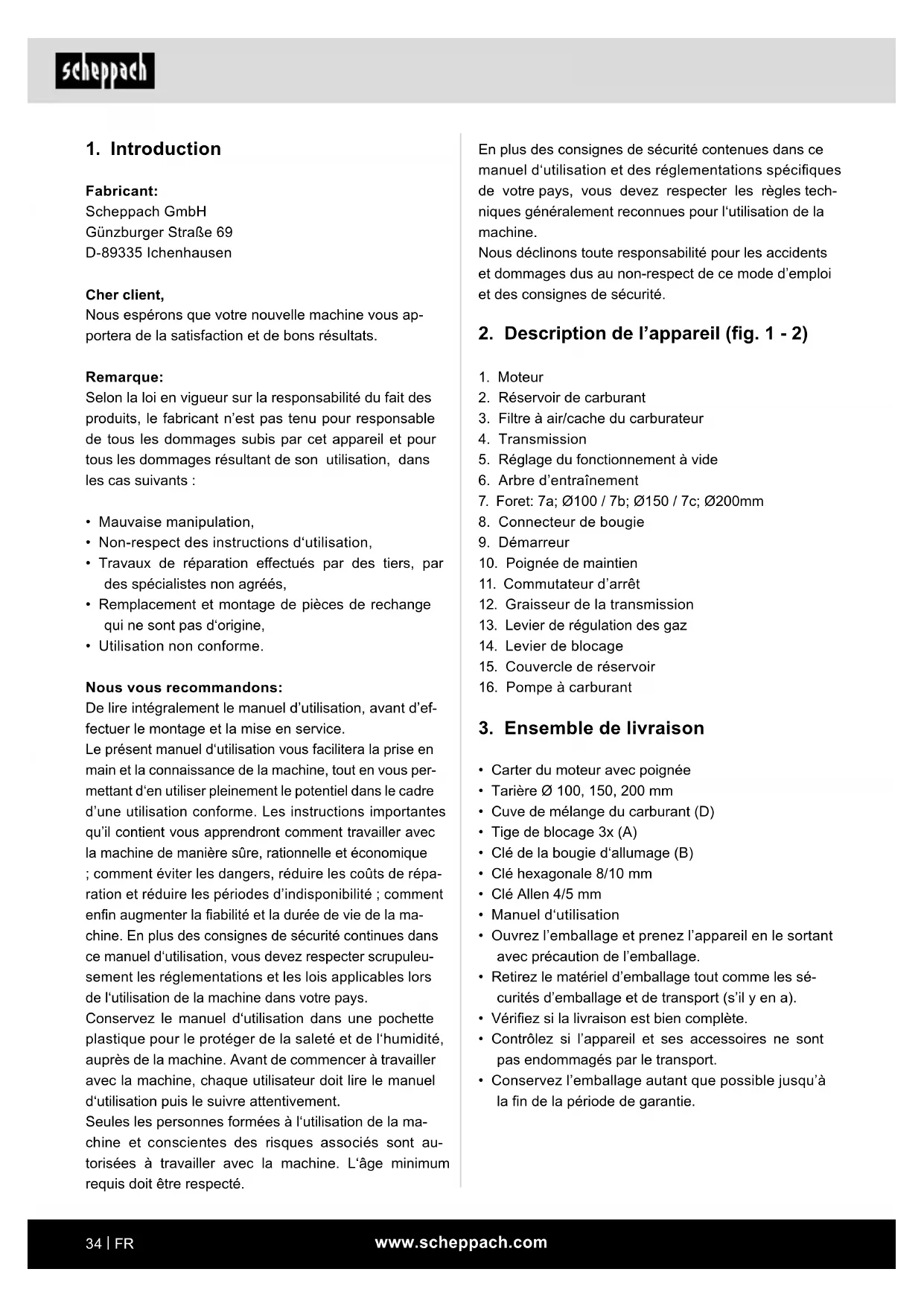 m ATTENTION ! Avant la mise en service, monter impérativement l’appareil en entier ! Avant la mise en service, il est important de connaître et de suivre les consignes de sécurité. Avant tout travail avec la mototarière, éteignez toujours le moteur, retirez les connecteurs branchés et portez des gants de protection. On peut démarrer la motota- rière seulement après avoir eectué l‘assemblage et toutes les vérications. ATTENTION ! Lisez attentivement les consignes de sécurité (voir „ Consignes de sécurité “ et les informa- tions supplémentaires pour les machines fonctionnant avec de l‘essence). Attention ! Portez des chaussures de sécurité et des vêtements de travail ajustés pour éviter les blessures. Avant la mise en service, il est important de connaître et de suivre les consignes de sécurité.www.scheppach.com