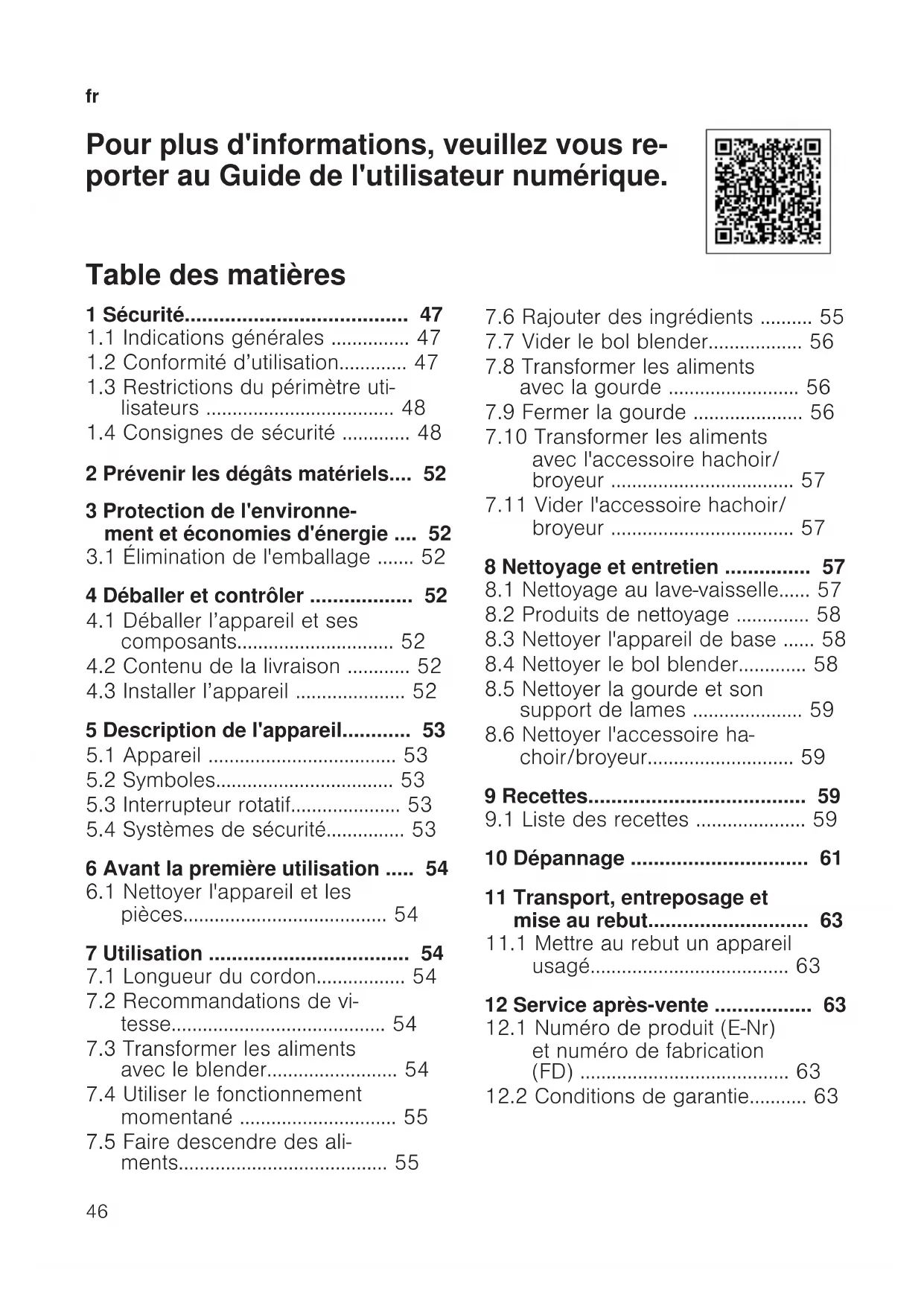 Pour plus d'informations, veuillez vous re- porter au Guide de l'utilisateur numérique. Table des matières 1 Sécurité.......................................47