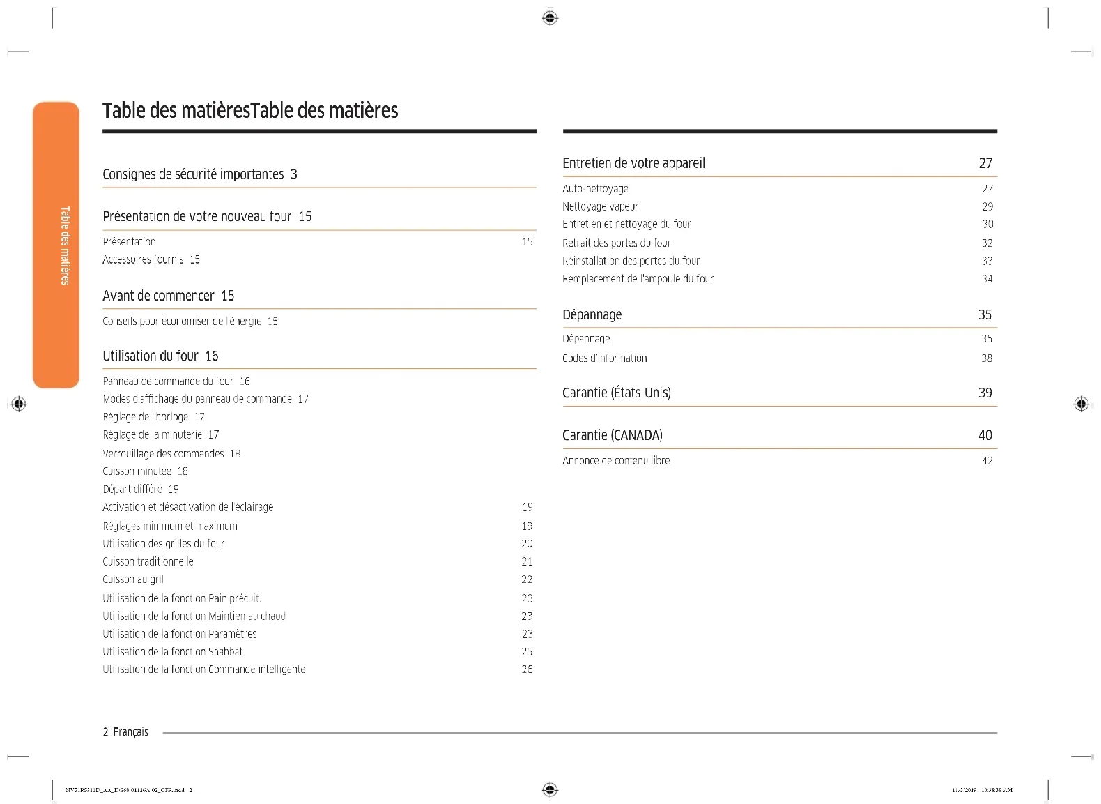 - Reportez-vous au chapitre relatif à l'auto-nettoyage, en page 27. Problème Cause possible Solution Odeur forte. Il est normal de constater une odeur provenant de l'isolation de la cavité du four lors des premières utilisations de votre four. Faites fonctionner à vide le four en mode Bake (Cuisson traditionnelle) sur 400 °F pendant 1 heure. Vous avez des difcultés à faire glisser les grilles du four. Les grilles, brillantes et de couleur argentée, ont été nettoyées au cours d'un cycle d'auto-nettoyage. À l'aide de papier absorbant imbibé d'huile végétale, essuyez les bords des grilles du four. La porte du four est verrouillée. Le disjoncteur s'est déclenché ou une coupure de courant est survenue alors que la porte du four était verrouillée. Activez la fonction Control Lockout (Verrouillage des commandes), puis déverrouillez la commande. Reportez- vous à la section Verrouillage des commandes en page 18. NV51R5511D_AA_DG68-01126A-02_CFR.indd 37 11/5/2019 10:38:47 AM38 Français Dépannage Dépannage Codes d’information FOUR Code afché Cause possible Solution C-d0 Ce code apparaît si la touche Contrôle est court-circuitée pendant 1 minute. Nettoyez les boutons et assurez- vous qu'il n'y a pas d'eau autour d'eux. Éteignez le four et réessayez. Si le problème persiste, prenez contact avec un centre de dépannage Samsung local. C-d1 Ce code apparaît si le verrouillage de la porte est mal positionné. Appuyez sur OVEN OFF (ARRÊT DU FOUR) et redémarrez le four. Si le problème persiste, coupez toute l'alimentation du four pendant au moins 30 secondes puis rétablissez- la. Si le problème n'est pas résolu, contactez le service technique. C-F0 Ce code apparaît si la communication entre la carte de circuit imprimé principale et la carte de circuit imprimé secondaire est interrompue. C-F2 Ce code apparaît si la communication entre la carte de circuit imprimé principale et la carte de circuit imprimé des commandes tactiles est interrompue. C-20 Le capteur du four est ouvert lorsque le four est utilisé. Le capteur du four est court-circuité lorsque le four est utilisé. C-21 Ce code apparaît si la température interne augmente à un niveau anormalement élevé. Appuyez sur OVEN OFF (ARRÊT DU FOUR) et redémarrez le four. Si le problème persiste, coupez toute l'alimentation du four pendant au moins 30 secondes puis rétablissez- la. Si le problème n'est pas résolu, contactez le service technique. C-30 Le capteur de la carte de circuit imprimé est ouvert lorsque le four est utilisé. Le capteur de la carte de circuit imprimé est court-circuité lorsque le four est utilisé. Code afché Cause possible Solution C-31 Ce code apparaît si la température de la carte de circuit imprimé augmente à un niveau anormalement élevé. Contactez le service technique. C-A2 Le moteur de refroidissement fonctionne anormalement. Contactez le service technique. bAd LinE Ce code s'afche lorsque l'alimentation électrique est interrompue de manière impromptue. Rebranchez correctement les ls d'alimentation ; le message disparaît alors. NV51R5511D_AA_DG68-01126A-02_CFR.indd 38 11/5/2019 10:38:47 AMFrançais 39 Garantie Garantie (États-Unis) VEUILLEZ NE PAS JETER. CETTE PAGE REMPLACE LA PAGE DE GARANTIE CONTENUE DANS LE GUIDE D’UTILISATION ET D’ENTRETIEN.