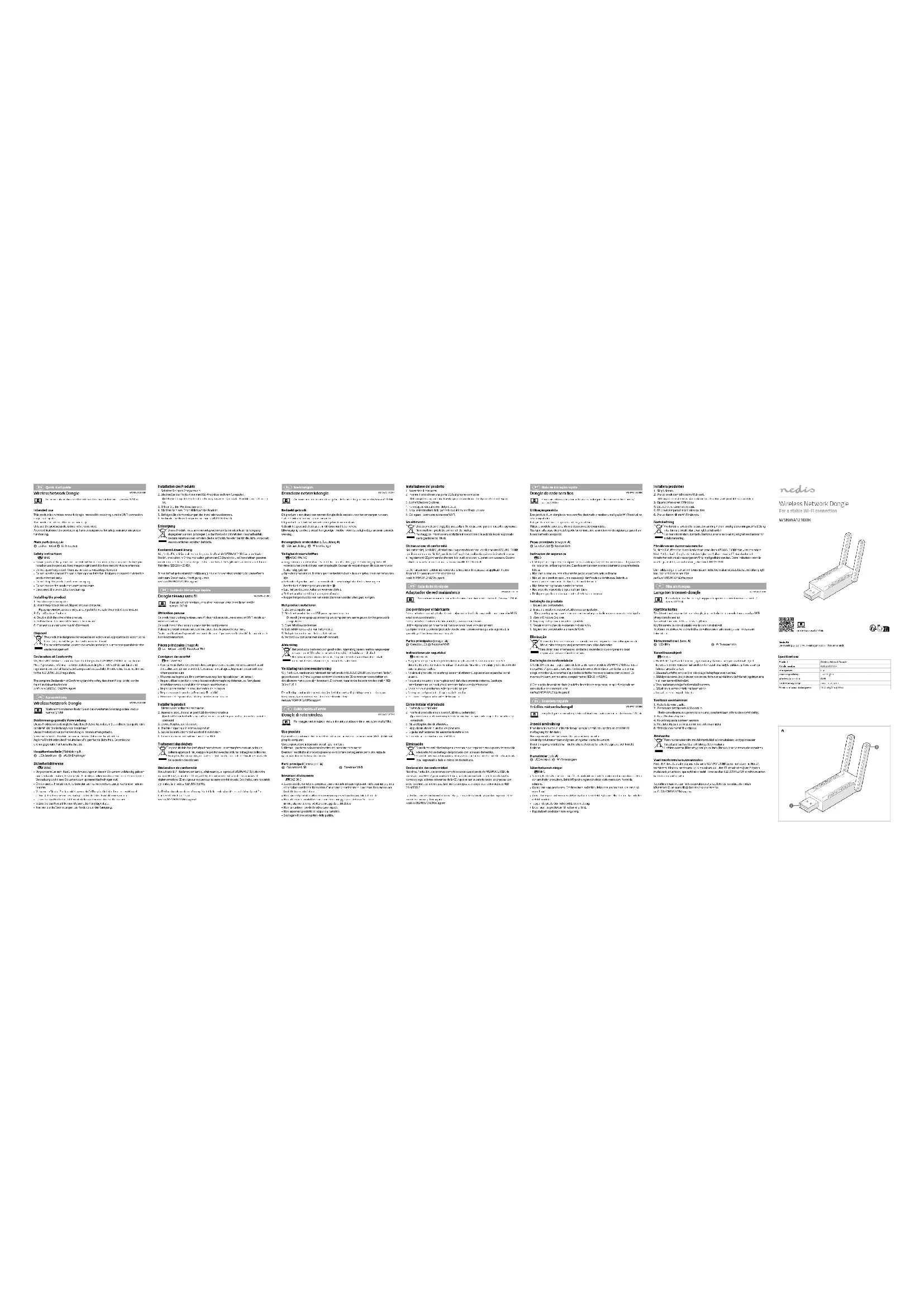 - Ne pas utiliser le produit si une pièce est endommagée ou défectueuse. Remplacez immédiatement un produit endommagé ou défectueux.• Ne pas laisser tomber le produit et éviter de le cogner.• Ne pas exposer le produit à l'eau ou à l'humidité.• Déconnectez le produit avant de procéder au nettoyage.Installer le produit1. Mettez votre ordinateur en marche.2. Insérez le produit dans un port USB de votre ordinateur. 4Une fenêtre contextuelle apparaît sur votre ordinateur pour indiquer que le produit est connecté.3. Ouvrez l’explorateur Windows.4. Double-cliquez sur le lecteur du produit.5. Suivez les instructions de l’assistant d’installation.6. Connectez votre ordinateur à un réseau Wi-Fi.Traitement des déchetsLe produit doit être jeté séparément des ordures ménagères dans un point de collecte approprié. Ne jetez pas le produit avec les ordures ménagères ordinaires.Pour plus d’informations, contactez le distributeur ou l’autorité locale responsable de la gestion des déchets.Déclaration de conformitéNous, Nedis B.V., déclarons en tant que fabricant que le produit WSNWA1210BK de notre marque Nedis®, produit en Chine, a été testé conformément à toutes les normes et réglementations CE en vigueur et que tous les tests ont été réussis. Cela inclut, sans toutefois s'y limiter, la directive RED 2014/53/UE.La Déclaration de conformité complète (et la che de sécurité le cas échéant) peut être trouvée et téléchargée via :nedis.fr/WSNWA1210BK#support Guia de iniciação rápida Dongle de rede sem os WSNWA1210BKPara mais informações, consulte a versão alargada do manual on-line: ned.is/wsnwa1210bkUtilização previstaEste produto é um dongle de rede sem os destinado a receber uma ligação Wi-Fi estável no seu computador.Este produto destina-se apenas a utilização interior.Utilize o produto apenas conforme descrito neste documento.Qualquer alteração do produto pode ter consequências em termos de segurança, garantia e funcionamento adequado.Peças principais (imagem A)1 Conetor USB 2 Recetor Wi-FiInstruções de segurança -AVISO
