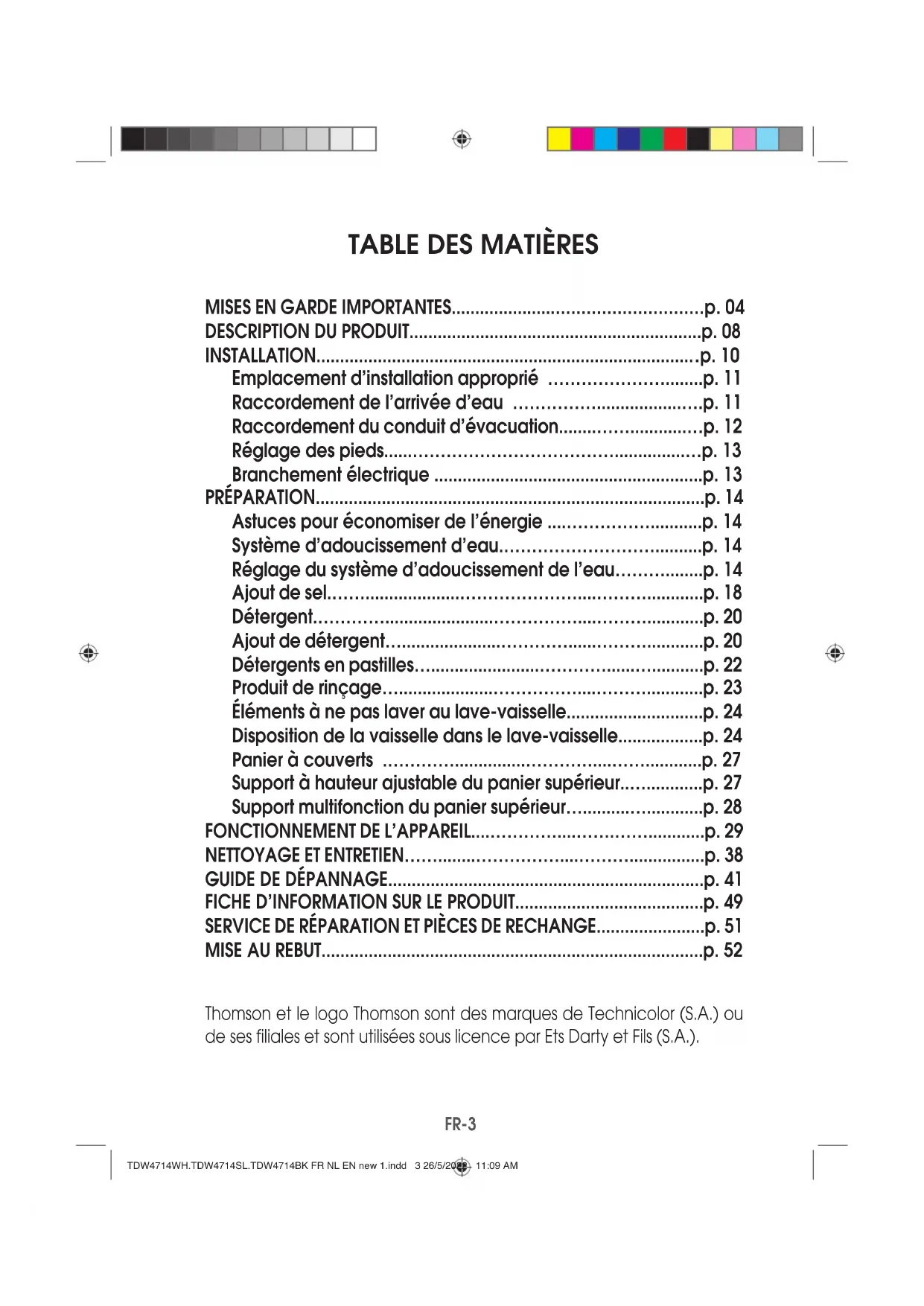 Besoin d’un conseil ? Une question sur ce produit ? RDV sur la communauté SAV Darty : https://sav.darty.com Déjà 1/2 million de solutions grâce à l’avis des utilisateurs. THOMSON LAVE-VAISSELLE TDW4714 WH TDW4714SL TDW4714 BK MANUEL D’UTILISATIONTDW4714WH.TDW4714SL.TDW4714BK FR NL EN new 1.indd 1 26/5/2022 11:09 AMTDW4714WH.TDW4714SL.TDW4714BK FR NL EN new 1.indd 2 26/5/2022 11:09 AMFR-3 Thomson et le logo Thomson sont des marques de Technicolor (S.A.) ou de ses filiales et sont utilisées sous licence par Ets Darty et Fils (S.A.).