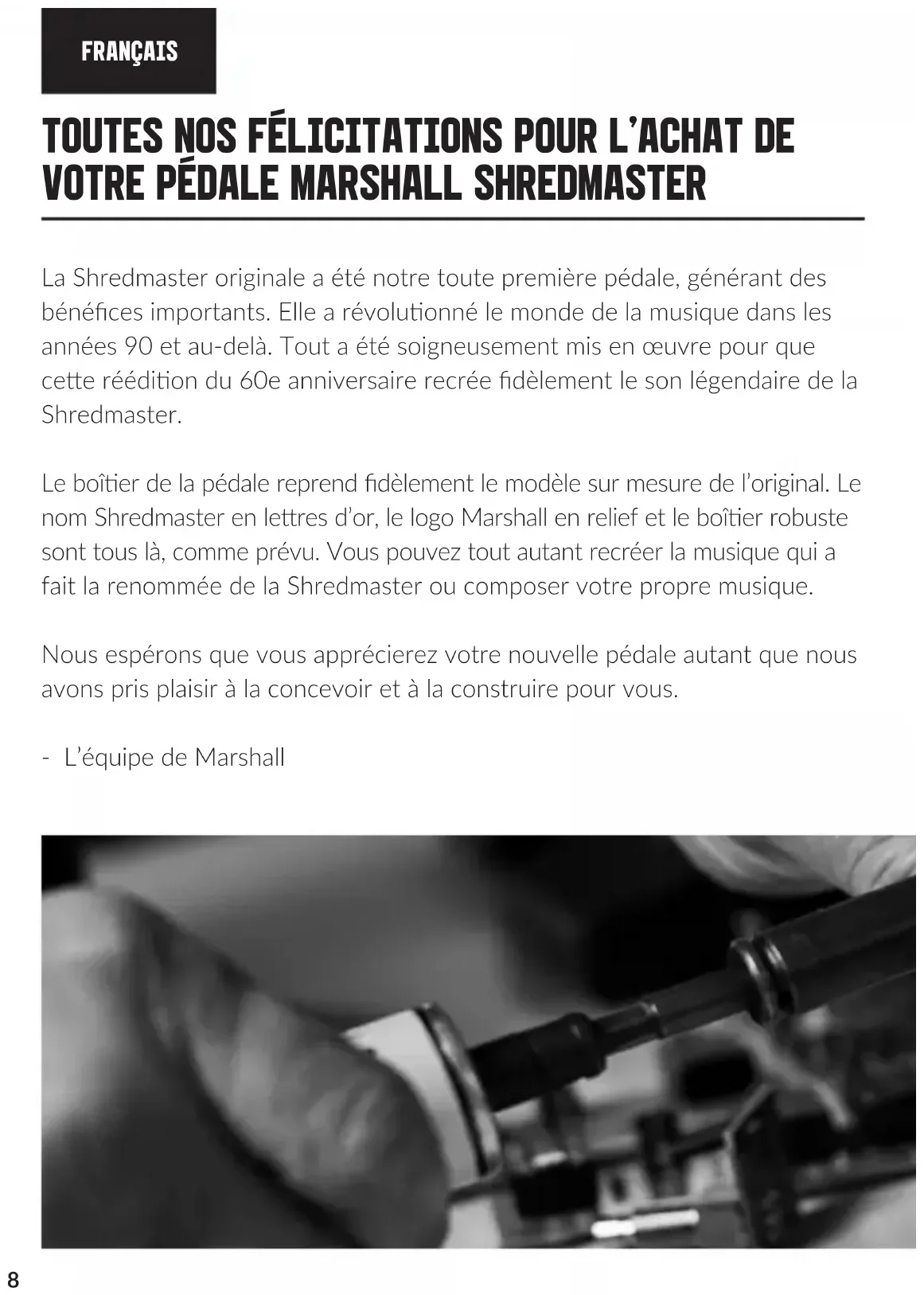 La Shredmaster originale a été notre toute première pédale, générant des bénéces importants. Elle a révoluonné le monde de la musique dans les années 90 et au-delà. Tout a été soigneusement mis en œuvre pour que cee réédion du 60e anniversaire recrée dèlement le son légendaire de la Shredmaster. Le boîer de la pédale reprend dèlement le modèle sur mesure de l’original. Le nom Shredmaster en leres d’or, le logo Marshall en relief et le boîer robuste sont tous là, comme prévu. Vous pouvez tout autant recréer la musique qui a fait la renommée de la Shredmaster ou composer votre propre musique. Nous espérons que vous apprécierez votre nouvelle pédale autant que nous avons pris plaisir à la concevoir et à la construire pour vous. - L’équipe de Marshall9 FRANÇAIS