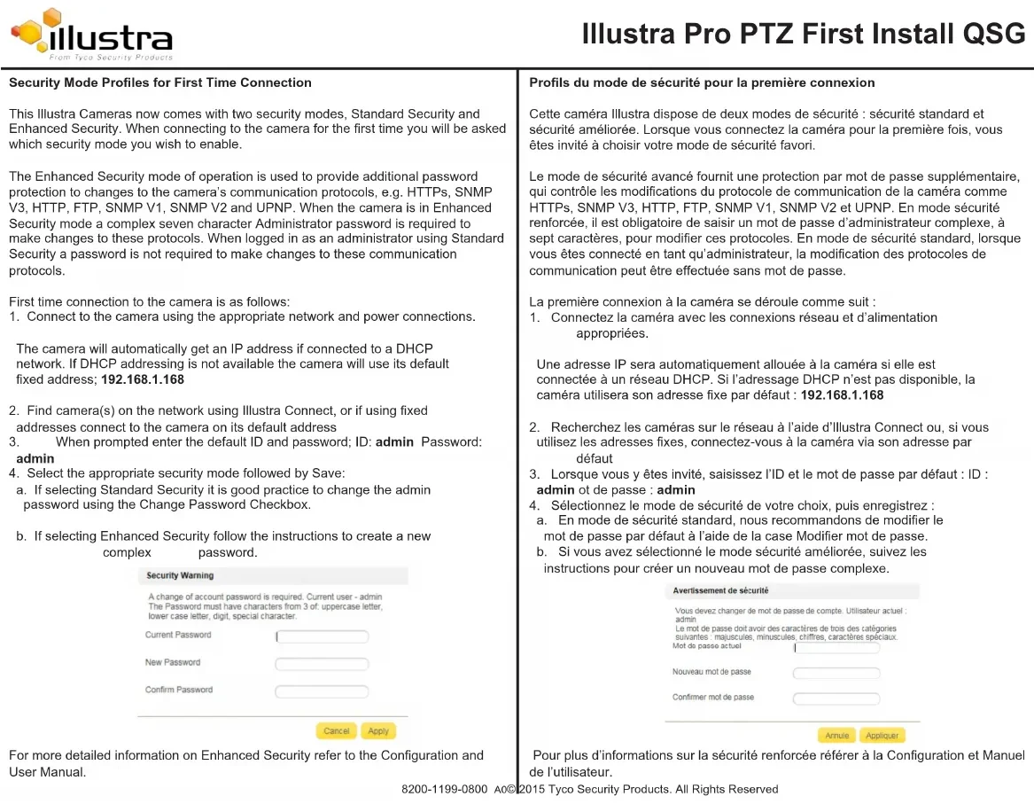 a. If selecting Standard Security it is good practice to change the admin password using the Change Password Checkbox. b. If selecting Enhanced Security follow the instructions to create a new complex password. For more detailed information on Enhanced Security refer to the Conguration and User Manual. 8200-1199-0800 A0© 2015 Tyco Security Products. All Rights Reserved Illustra Pro PTZ First Install QSG Prols du mode de sécurité pour la première connexion Cette caméra Illustra dispose de deux modes de sécurité : sécurité standard et sécurité améliorée. Lorsque vous connectez la caméra pour la première fois, vous êtes invité à choisir votre mode de sécurité favori. Le mode de sécurité avancé fournit une protection par mot de passe supplémentaire, qui contrôle les modications du protocole de communication de la caméra comme HTTPs, SNMP V3, HTTP, FTP, SNMP V1, SNMP V2 et UPNP. En mode sécurité renforcée, il est obligatoire de saisir un mot de passe d’administrateur complexe, à sept caractères, pour modier ces protocoles. En mode de sécurité standard, lorsque vous êtes connecté en tant qu’administrateur, la modication des protocoles de communication peut être effectuée sans mot de passe. La première connexion à la caméra se déroule comme suit :