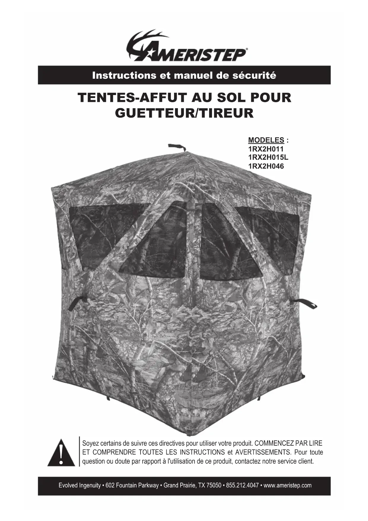 Figure 1 Figure 2 Figure 3 Remarque : Si vous ne pouvez pas accéder au nœud de la paroi quand vous commencez à soulever la tente-affût à l’étape 4, tournez légèrement la paroi ouverte de la gauche vers la droite comme indiqué sur la gure 3 tout en soulevant. La tente-affût pourra ainsi s’ouvrir de manière à ce que vous puissiez tirer les nœuds restants dans la position souhaitée. Continuez autour de la tente-affût en tirant chaque nœud central jusqu’à ce qu’ils soient tous parfaitement tendus à l’exception du nœud latéral de la porte comme indiqué sur la gure 5. Soulevez la tente-affût jusqu'à ce que vous puissiez accéder à un autre nœud de paroi et tirez fermement jusqu'à ce que la paroi s’ouvre comme indiqué sur la gure 4. Tirez fermement l’un des nœuds jusqu'à ce qu'il s’ouvre. Remarque : Le nœud latéral de la porte devrait être ouvert en dernier. Vous devriez maintenant procéder à l'installation de votre tente-affût. Utilisez des sardines pour xer la tente-affût au sol. Réglez les fenêtres et ajoutez des broussailles sur les poches autogrippantes (si elles existent sur votre modèle) pour optimiser votre camouage. IMPORTANT : Veillez à ce que les fermetures éclairs de la porte soient complètement fer- mées de manière à ce que la paroi reste bien tendue. Tirez maintenant le NOEUD DE LA PORTE vers l’extérieur. REMARQUE : Les images utilisées n’ont qu'un but informatif et peuvent ne pas décrire le produit actuel. Figure 5 Figure 6 Inclus dans la livraison : 1 tente-affût au sol 1 sac à dos de transport Sardines Ancrages Figure 4Evolved Ingenuity • 602 Fountain Parkway • Grand Prairie, TX 75050 • 855.212.4047 • www.ameristep.com