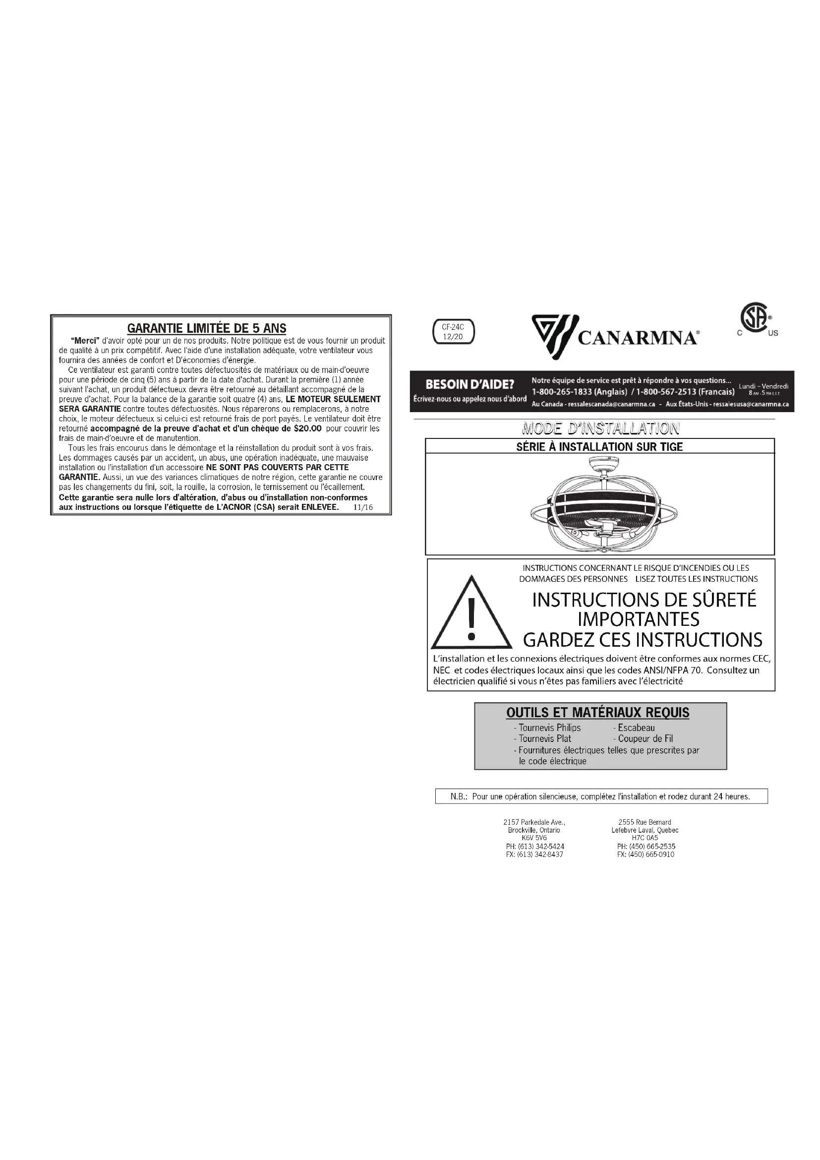 “Merci” d’avoir opté pour un de nos produits. Notre politique est de vous fournir un produit de qualité à un prix compétitif. Avec l’aide d’une installation adéquate, votre ventilateur vous fournira des années de confort et D’économies d’énergie. Ce ventilateur est garanti contre toutes défectuosités de matériaux ou de main-d’oeuvre pour une période de cinq (5) ans à partir de la date d’achat. Durant la première (1) année suivant l’achat, un produit défectueux devra être retourné au détaillant accompagné de la preuve d’achat. Pour la balance de la garantie soit quatre (4) ans, LE MOTEUR SEULEMENT SERA GARANTIE contre toutes défectuosités. Nous réparerons ou remplacerons, à notre choix, le moteur défectueux si celui-ci est retourné frais de port payés. Le ventilateur doit être retourné accompagné de la preuve d’achat et d’un chèque de $20.00 pour couvrir les frais de main-d’oeuvre et de manutention. Tous les frais encourus dans le démontage et la réinstallation du produit sont à vos frais. Les dommages causés par un accident, un abus, une opération inadéquate, une mauvaise installation ou l’installation d’un accessoire NE SONT PAS COUVERTS PAR CETTE GARANTIE. Aussi, un vue des variances climatiques de notre région, cette garantie ne couvre pas les changements du fini, soit, la rouille, la corrosion, le ternissement ou l’écaillement. Cette garantie sera nulle lors d’altération, d’abus ou d’installation non-conformes aux instructions ou lorsque l’étiquette de L’ACNOR (CSA) serait ENLEVEE. 11/16 CF-24C