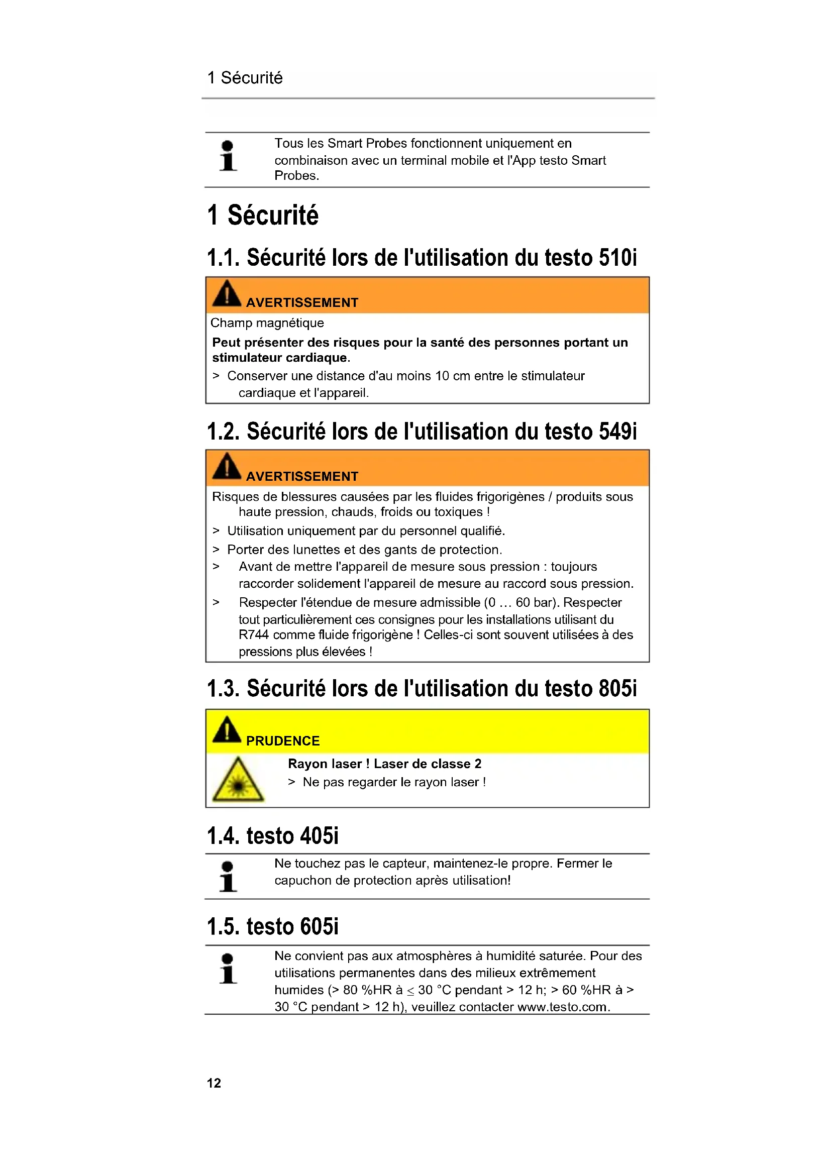 Tous les Smart Probes fonctionnent uniquement en combinaison avec un terminal mobile et l'App testo Smart Probes. 1 Sécurité 1.1. Sécurité lors de l'utilisation du testo 510i AVERTISSEMENT Champ magnétique Peut présenter des risques pour la santé des personnes portant un stimulateur cardiaque. > Conserver une distance d'au moins 10 cm entre le stimulateur cardiaque et l'appareil. 1.2. Sécurité lors de l'utilisation du testo 549i AVERTISSEMENT Risques de blessures causées par les fluides frigorigènes / produits sous haute pression, chauds, froids ou toxiques ! > Utilisation uniquement par du personnel qualifié. > Porter des lunettes et des gants de protection. > Avant de mettre l'appareil de mesure sous pression : toujours raccorder solidement l'appareil de mesure au raccord sous pression. > Respecter l'étendue de mesure admissible (0 … 60 bar). Respecter tout particulièrement ces consignes pour les installations utilisant du R744 comme fluide frigorigène ! Celles-ci sont souvent utilisées à des pressions plus élevées ! 1.3. Sécurité lors de l'utilisation du testo 805i PRUDENCE Rayon laser ! Laser de classe 2 > Ne pas regarder le rayon laser ! 1.4. testo 405i Ne touchez pas le capteur, maintenez-le propre. Fermer le capuchon de protection après utilisation! 1.5. testo 605i Ne convient pas aux atmosphères à humidité saturée. Pour des utilisations permanentes dans des milieux extrêmement humides (> 80 %HR à
