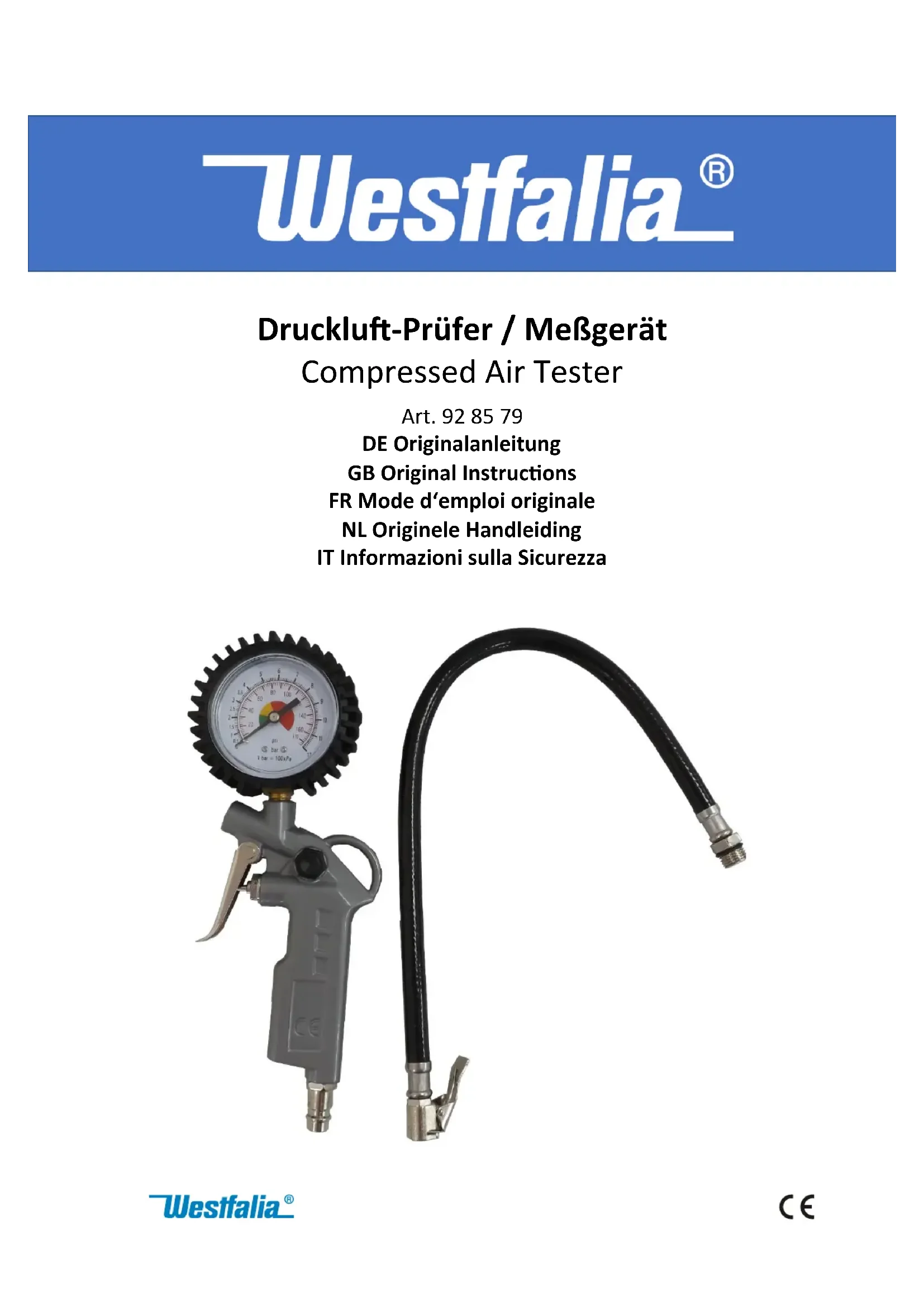 The moment you are filling in the air, the manometer (1) shows a pressure that is a little bit higher than the actual tyre pressure. When you release the trigger, you can read the actual tyre pressure on the manometer. Deflation of Air If the tyre pressure is too high, use the deflation button (3) and slowly reduce the air pressure to the desired value. Cleaning and Maintenance Do not allow foreign substances and dirt to enter the compressed air nozzle. Do not expose the manometer to vibrations or mechanical stress. Add a few drops of oil to the sealing of the trigger pin in regular intervals. Apart from that the device is maintenance free. Storing Store the device indoors in a dry place that is protected from dust, dirt and extreme temperatures. Store the device out of reach of children. For storing the device, use the hanger (2). Technical Data Pressure Range: from 0 – 10 bar Diameter of Pressure Gauge: 6 cm Tube Length: approx. 44 cm Manometer Accuracy: ± 0.1 bar Connection of Quick Coupling Adapter: R ¼”11 S'il vous plaît noter afin d'éviter des dysfonctionnements, des dommages et des effets néfastes sur la santé les informations suivantes: Veuillez lire attentivement ce manuel et utiliser l'appareil uniquement conformément à ce manuel. Éliminez les matériaux d'emballage inutiles ou stockez-les dans un endroit inaccessible aux enfants. Il y a danger d’étouffement! Les personnes ayant des capacités physiques, sensorielles ou mentales limitées ne peuvent utiliser le dispositif que si elles sont supervisées et instruites par un soignant. Gardez l'appareil hors de portée des enfants. Pour votre propre sécurité, utilisez toujours l'adaptateur de raccord rapide pour connecter l'appareil à l'alimentation en air et réglez toujours la pression de travail à l'aide d'un régulateur de pression. Ne dépassez pas le max. pression d'air de travail autorisée. Veuillez vous référer aux données techniques. N'utilisez jamais d'oxygène ou de gaz inflammables comme source d'énergie. Vérifiez si toutes les connexions et tous les tuyaux sont fixés mécaniquement et s'ils fonctionnent correctement. Des flexibles desserrés peuvent provoquer des blessures graves. N'utilisez que des adaptateurs à couplage rapide. Débranchez l'outil pneumatique de la source d'air comprimé avant d'effectuer tout travail d'entretien ou lorsqu'il n'est pas utilisé. Ne modifiez en aucun cas l'appareil et ne l'utilisez pas à des fins non prévues. Utilisez uniquement l'accessoire d'origine. L'accessoire non recommandé peut comporter un risque de danger. Si l'appareil est endommagé, arrêtez d'utiliser l'appareil et faites-le réparer par un spécialiste ou contactez notre service clientèle. Ne démontez pas l'appareil et ne tentez pas votre propre réparation.