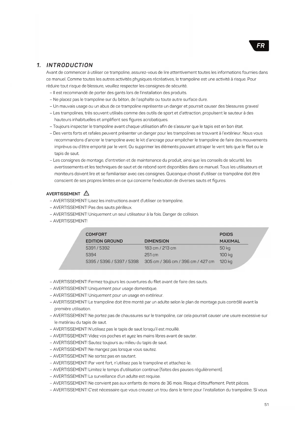 Avant de commencer à utiliser ce trampoline, assurez-vous de lire attentivement toutes les informations fournies dans ce manuel. Comme toutes les autres activités physiques récréatives, le trampoline est une activité à risque. Pour réduire tout risque de blessure, veuillez respecter les consignes de sécurité. – Il est recommandé de porter des gants lors de l’installation des produits. – Ne placez pas le trampoline sur du béton, de l’asphalte ou toute autre surface dure. – Un mauvais usage ou un abus de ce trampoline représente un danger et pourrait causer des blessures graves! – Les trampolines, très souvent utilisés comme des outils de sport et d’attraction, propulsent le sauteur à des hauteurs inhabituelles et amplifient ses figures acrobatiques. – Toujours inspecter le trampoline avant chaque utilisation afin de s’assurer que le tapis est en bon état. – Des vents forts et rafales peuvent présenter un danger pour les trampolines se trouvant à l’extérieur. Nous vous recommandons d’ancrer le trampoline avec le kit d’ancrage pour empêcher le trampoline de faire des mouvements imprévus ou d’être emporté par le vent. Ou supprimer les éléments pouvant attraper le vent tels que le filet ou le tapis de saut. – Les consignes de montage, d’entretien et de maintenance du produit, ainsi que les conseils de sécurité, les avertissements et les techniques de saut et de rebond sont disponibles dans ce manuel. Tous les utilisateurs et moniteurs doivent lire et se familiariser avec ces consignes. Quiconque choisit d’utiliser ce trampoline doit être conscient de ses propres limites en ce qui concerne l’exécution de diverses sauts et figures. AVERTISSEMENT – AVERTISSEMENT! Lisez les instructions avant d’utiliser ce trampoline. – AVERTISSEMENT! Pas des sauts périlleux. – AVERTISSEMENT! Uniquement un seul utilisateur à la fois. Danger de collision. – AVERTISSEMENT!