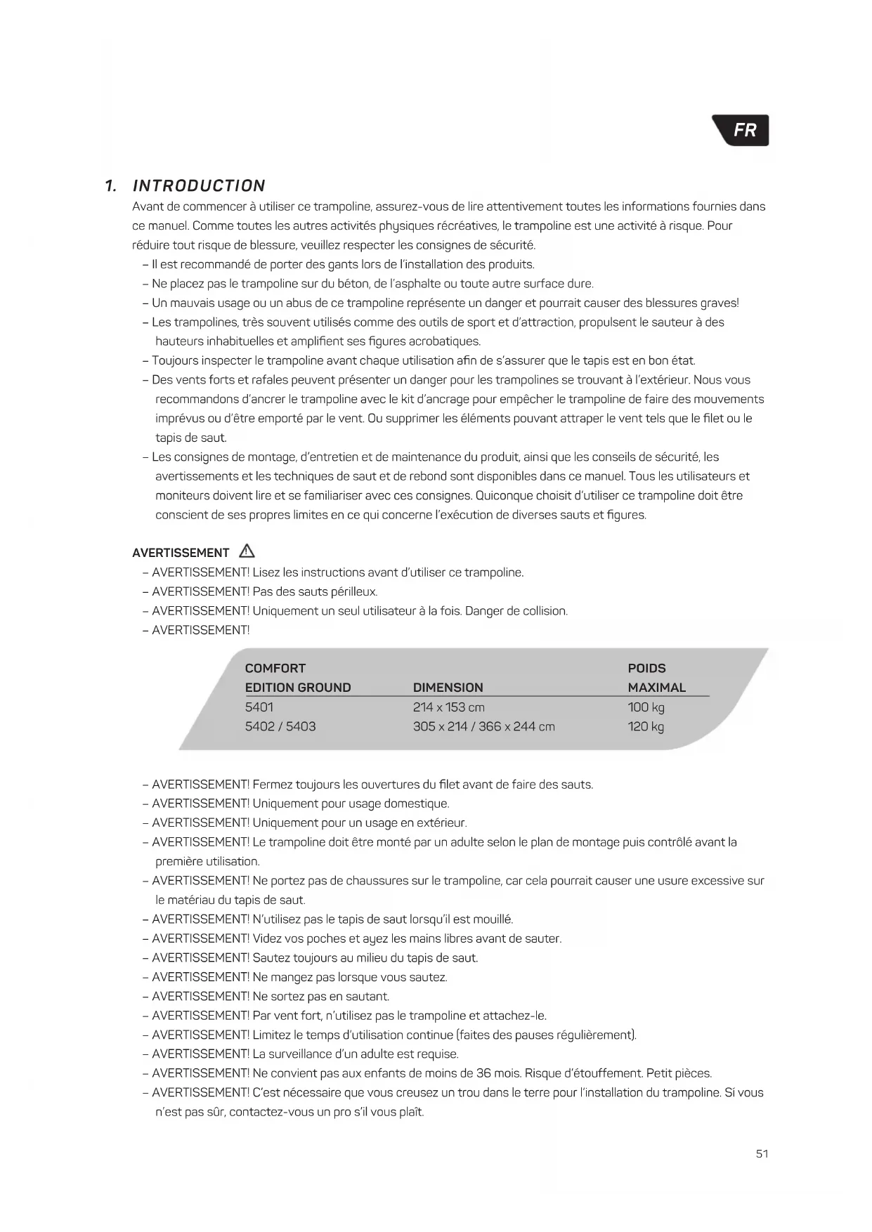 Avant de commencer à utiliser ce trampoline, assurez-vous de lire attentivement toutes les informations fournies dans ce manuel. Comme toutes les autres activités physiques récréatives, le trampoline est une activité à risque. Pour réduire tout risque de blessure, veuillez respecter les consignes de sécurité. – Il est recommandé de porter des gants lors de l’installation des produits. – Ne placez pas le trampoline sur du béton, de l’asphalte ou toute autre surface dure. – Un mauvais usage ou un abus de ce trampoline représente un danger et pourrait causer des blessures graves! – Les trampolines, très souvent utilisés comme des outils de sport et d’attraction, propulsent le sauteur à des hauteurs inhabituelles et amplifient ses figures acrobatiques. – Toujours inspecter le trampoline avant chaque utilisation afin de s’assurer que le tapis est en bon état. – Des vents forts et rafales peuvent présenter un danger pour les trampolines se trouvant à l’extérieur. Nous vous recommandons d’ancrer le trampoline avec le kit d’ancrage pour empêcher le trampoline de faire des mouvements imprévus ou d’être emporté par le vent. Ou supprimer les éléments pouvant attraper le vent tels que le filet ou le tapis de saut. – Les consignes de montage, d’entretien et de maintenance du produit, ainsi que les conseils de sécurité, les avertissements et les techniques de saut et de rebond sont disponibles dans ce manuel. Tous les utilisateurs et moniteurs doivent lire et se familiariser avec ces consignes. Quiconque choisit d’utiliser ce trampoline doit être conscient de ses propres limites en ce qui concerne l’exécution de diverses sauts et figures. AVERTISSEMENT – AVERTISSEMENT! Lisez les instructions avant d’utiliser ce trampoline. – AVERTISSEMENT! Pas des sauts périlleux. – AVERTISSEMENT! Uniquement un seul utilisateur à la fois. Danger de collision. – AVERTISSEMENT!