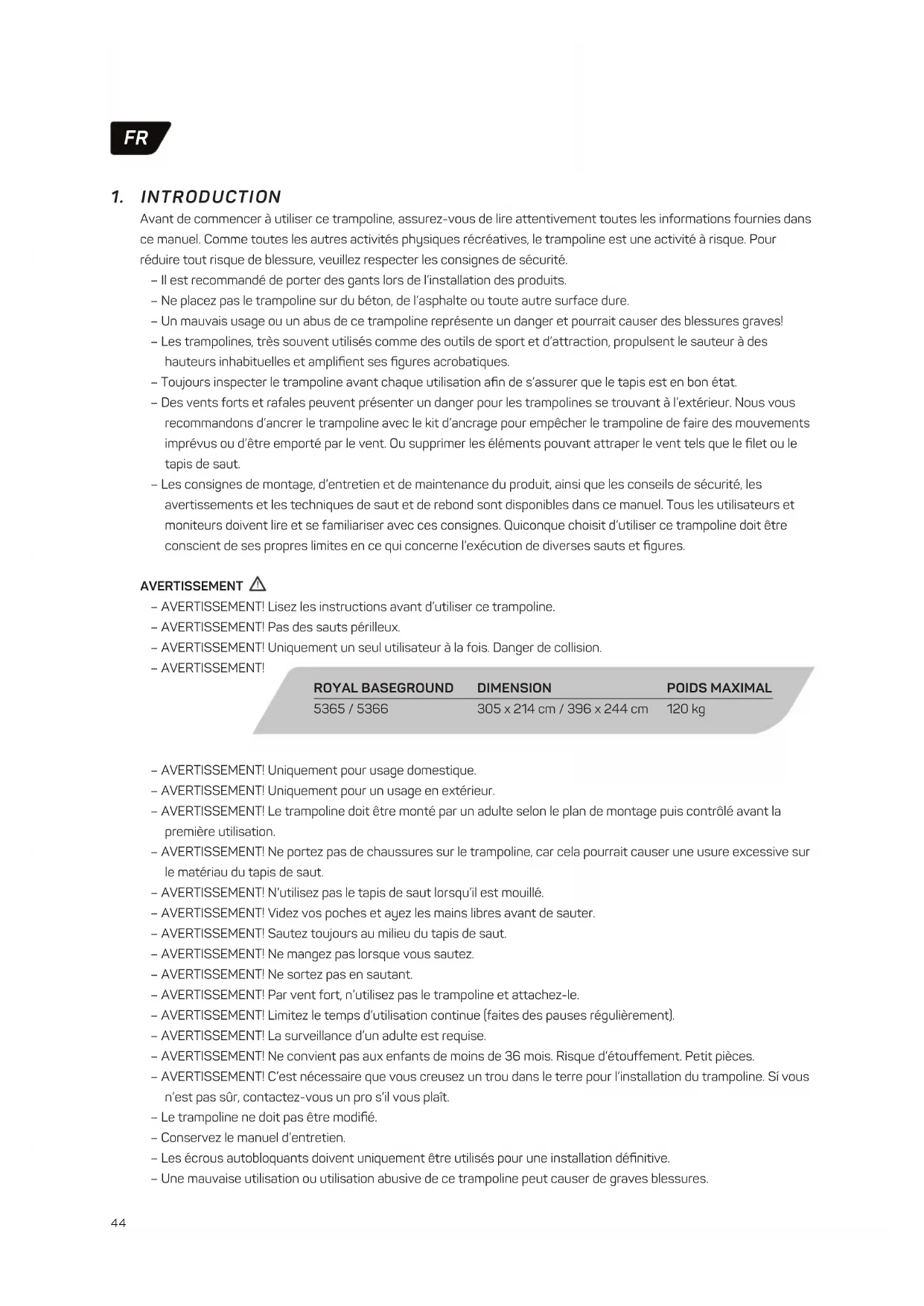 FR51 Conditions venteuses En cas de vents soutenus, le trampoline pourrait se déplacer. En cas de vents violents, le trampoline devrait être mis l’abris ou démonté. Déplacement du trampoline Le trampoline ne peut être déplacé que par deux personnes ou plus. Pour tout type de mouvement, vous devez démonter le trampoline.tie downs should be used. FR52 ROYAL BASEGROUND 5365 / 5366 STØRRELSE 305 x 214 cm / 396 x 244 cm