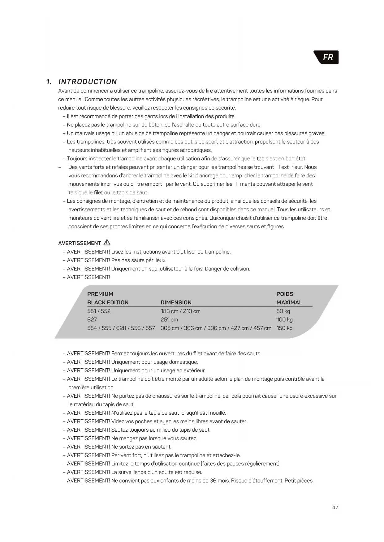 Avant de commencer à utiliser ce trampoline, assurez-vous de lire attentivement toutes les informations fournies dans ce manuel. Comme toutes les autres activités physiques récréatives, le trampoline est une activité à risque. Pour réduire tout risque de blessure, veuillez respecter les consignes de sécurité. – Il est recommandé de porter des gants lors de l’installation des produits. – Ne placez pas le trampoline sur du béton, de l’asphalte ou toute autre surface dure. – Un mauvais usage ou un abus de ce trampoline représente un danger et pourrait causer des blessures graves! – Les trampolines, très souvent utilisés comme des outils de sport et d’attraction, propulsent le sauteur à des hauteurs inhabituelles et amplifient ses figures acrobatiques. – Toujours inspecter le trampoline avant chaque utilisation afin de s’assurer que le tapis est en bon état. – Des vents forts et rafales peuvent pr senter un danger pour les trampolines se trouvant l’ext rieur. Nous vous recommandons d’ancrer le trampoline avec le kit d’ancrage pour emp cher le trampoline de faire des mouvements impr vus ou d’ tre emport par le vent. Ou supprimer les l ments pouvant attraper le vent tels que le filet ou le tapis de saut. – Les consignes de montage, d’entretien et de maintenance du produit, ainsi que les conseils de sécurité, les avertissements et les techniques de saut et de rebond sont disponibles dans ce manuel. Tous les utilisateurs et moniteurs doivent lire et se familiariser avec ces consignes. Quiconque choisit d’utiliser ce trampoline doit être conscient de ses propres limites en ce qui concerne l’exécution de diverses sauts et figures. AVERTISSEMENT – AVERTISSEMENT! Lisez les instructions avant d’utiliser ce trampoline. – AVERTISSEMENT! Pas des sauts périlleux. – AVERTISSEMENT! Uniquement un seul utilisateur à la fois. Danger de collision. – AVERTISSEMENT!