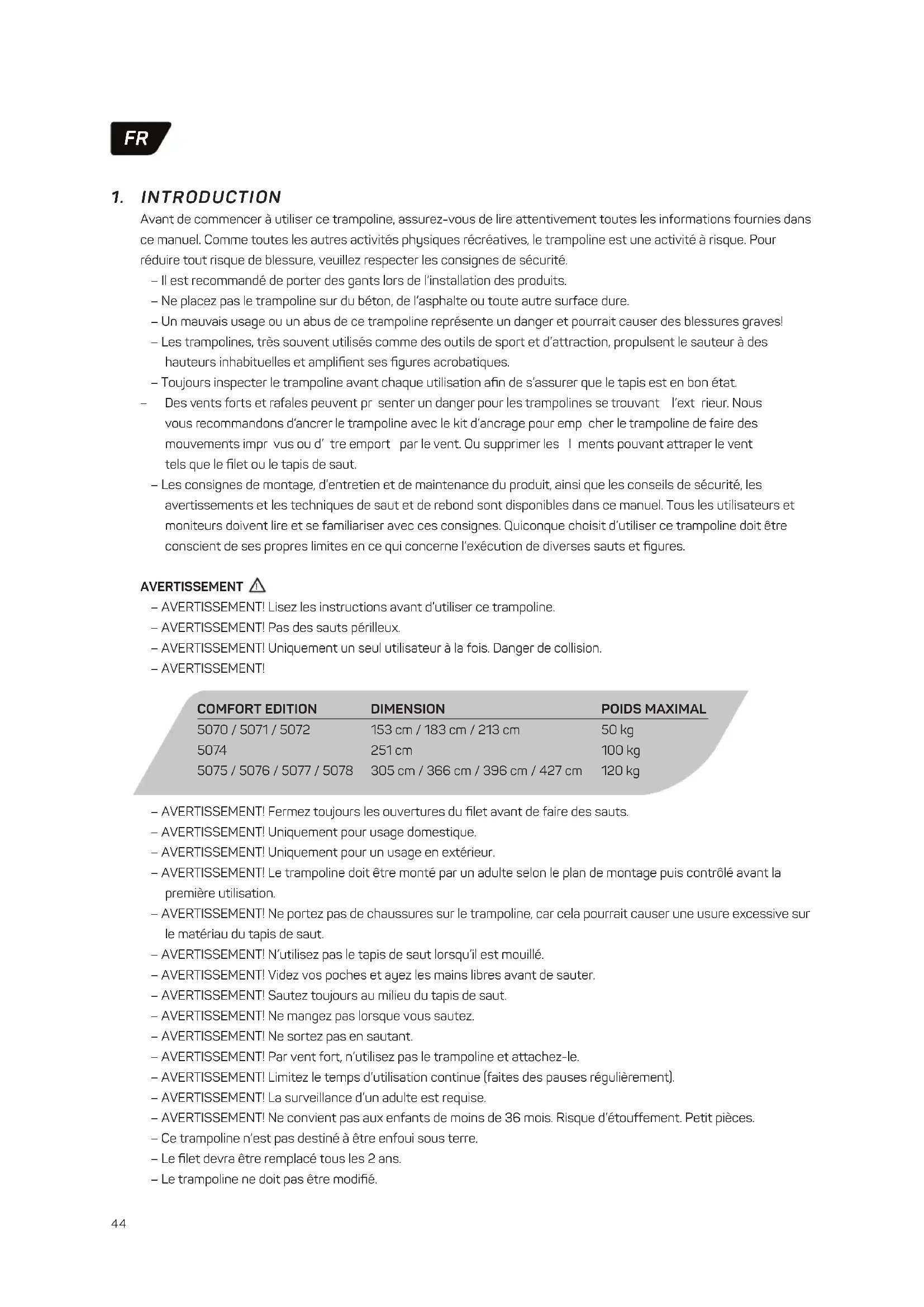 5075 / 5076 / 5077 / 5078 DIMENSION 153 cm / 183 cm / 213 cm 251 cm 305 cm / 366 cm / 396 cm / 427 cm POIDS MAXIMAL 50 kg 100 kg 120 kg FR45 – Conservez le manuel d’entretien. – Les écrous autobloquants doivent uniquement être utilisés pour une installation définitive. – Une mauvaise utilisation ou utilisation abusive de ce trampoline peut causer de graves blessures. – Inspectez avant utilisation et remplacez toute pièce usée, défectueuse ou manquante. – Respectez toutes les règles de sécurité associées à ce produit. – Ne convient pas à un enfant de moins de 36 mois, du fait de manque d’habileté. – Tenir à l’écart du feu. – Ne pas s’accrocher à, couper ou grimper sur le filet de sécurité. – Porter des vêtements dépourvus de cordons, crochets, boucles ou de tout ce qui pourrait se coincer ou s’accrocher à l’armature en acier. – Ne pas fixer quoi que ce soit sur le filet de protection qui ne soit pas un accessoire ou une pièce approuvée par le fabricant du produit. – Monter et descendre du trampoline par l’ouverture réservée à cet effet. – Consultez toujours un docteur/médecin avant d’effectuer tout type d’activité physique.