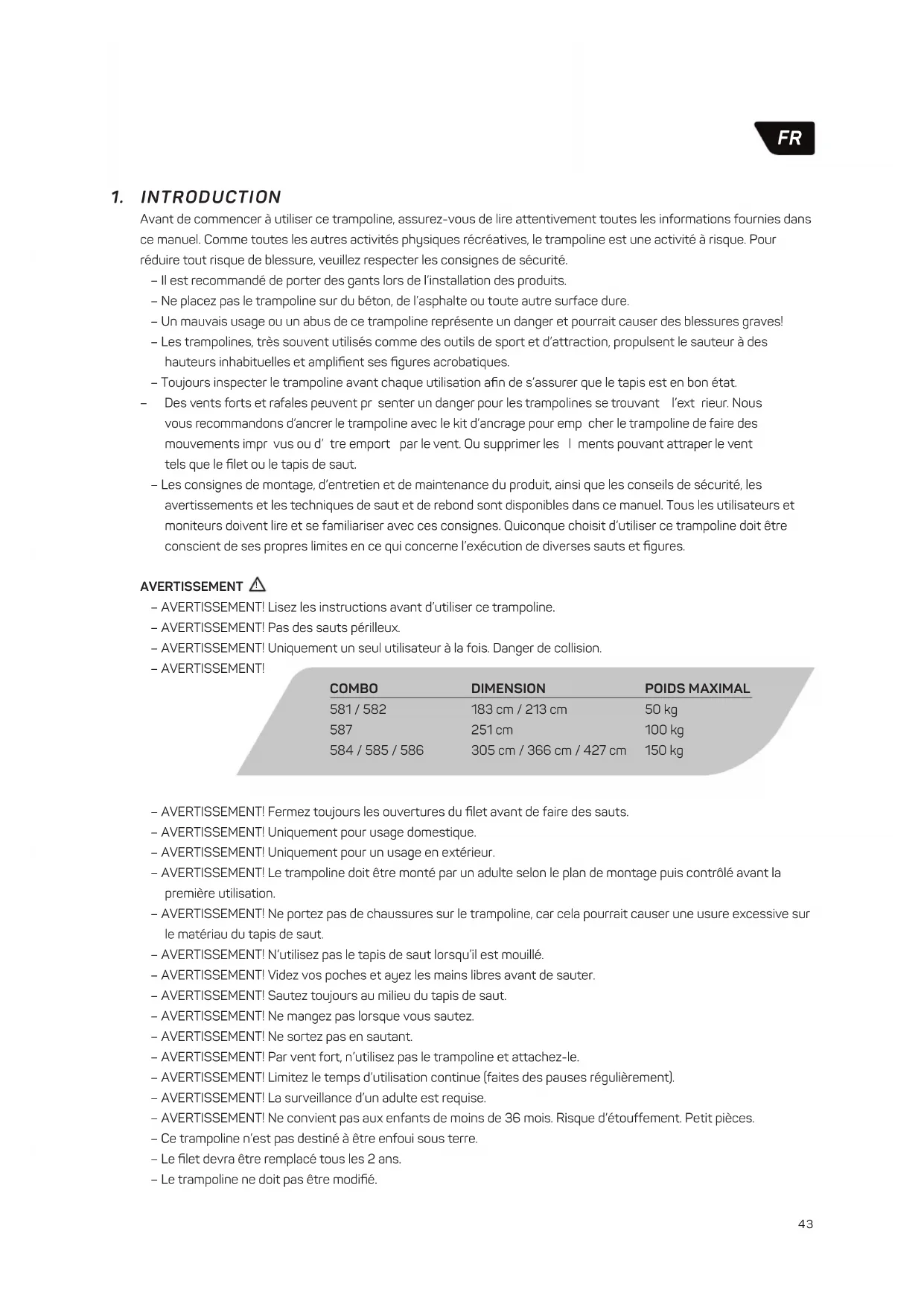 Avant de commencer à utiliser ce trampoline, assurez-vous de lire attentivement toutes les informations fournies dans ce manuel. Comme toutes les autres activités physiques récréatives, le trampoline est une activité à risque. Pour réduire tout risque de blessure, veuillez respecter les consignes de sécurité. – Il est recommandé de porter des gants lors de l’installation des produits. – Ne placez pas le trampoline sur du béton, de l’asphalte ou toute autre surface dure. – Un mauvais usage ou un abus de ce trampoline représente un danger et pourrait causer des blessures graves! – Les trampolines, très souvent utilisés comme des outils de sport et d’attraction, propulsent le sauteur à des hauteurs inhabituelles et amplifient ses figures acrobatiques. – Toujours inspecter le trampoline avant chaque utilisation afin de s’assurer que le tapis est en bon état. – Des vents forts et rafales peuvent pr senter un danger pour les trampolines se trouvant l’ext rieur. Nous vous recommandons d’ancrer le trampoline avec le kit d’ancrage pour emp cher le trampoline de faire des mouvements impr vus ou d’ tre emport par le vent. Ou supprimer les l ments pouvant attraper le vent tels que le filet ou le tapis de saut. – Les consignes de montage, d’entretien et de maintenance du produit, ainsi que les conseils de sécurité, les avertissements et les techniques de saut et de rebond sont disponibles dans ce manuel. Tous les utilisateurs et moniteurs doivent lire et se familiariser avec ces consignes. Quiconque choisit d’utiliser ce trampoline doit être conscient de ses propres limites en ce qui concerne l’exécution de diverses sauts et figures. AVERTISSEMENT – AVERTISSEMENT! Lisez les instructions avant d’utiliser ce trampoline. – AVERTISSEMENT! Pas des sauts périlleux. – AVERTISSEMENT! Uniquement un seul utilisateur à la fois. Danger de collision. – AVERTISSEMENT! – AVERTISSEMENT! Fermez toujours les ouvertures du filet avant de faire des sauts. – AVERTISSEMENT! Uniquement pour usage domestique. – AVERTISSEMENT! Uniquement pour un usage en extérieur. – AVERTISSEMENT! Le trampoline doit être monté par un adulte selon le plan de montage puis contrôlé avant la première utilisation. – AVERTISSEMENT! Ne portez pas de chaussures sur le trampoline, car cela pourrait causer une usure excessive sur le matériau du tapis de saut. – AVERTISSEMENT! N’utilisez pas le tapis de saut lorsqu’il est mouillé. – AVERTISSEMENT! Videz vos poches et ayez les mains libres avant de sauter. – AVERTISSEMENT! Sautez toujours au milieu du tapis de saut. – AVERTISSEMENT! Ne mangez pas lorsque vous sautez. – AVERTISSEMENT! Ne sortez pas en sautant. – AVERTISSEMENT! Par vent fort, n’utilisez pas le trampoline et attachez-le. – AVERTISSEMENT! Limitez le temps d’utilisation continue (faites des pauses régulièrement). – AVERTISSEMENT! La surveillance d’un adulte est requise. – AVERTISSEMENT! Ne convient pas aux enfants de moins de 36 mois. Risque d’étouffement. Petit pièces. – Ce trampoline n’est pas destiné à être enfoui sous terre. – Le filet devra être remplacé tous les 2 ans. – Le trampoline ne doit pas être modifié. COMBO 581 / 582