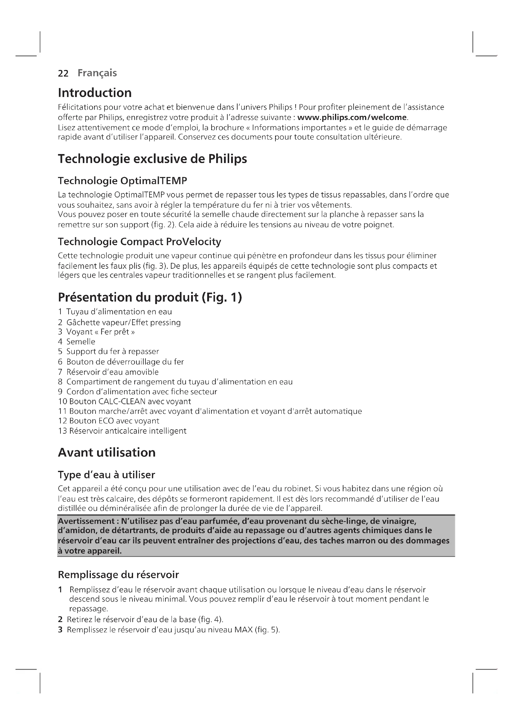 d’amidon, de détartrants, de produits d’aide au repassage ou d’autres agents chimiques dans le réservoir d’eau car ils peuvent entraîner des projections d’eau, des taches marron ou des dommages à votre appareil. Remplissage du réservoir 1 Remplissez d’eau le réservoir avant chaque utilisation ou lorsque le niveau d’eau dans le réservoir descend sous le niveau minimal. Vous pouvez remplir d’eau le réservoir à tout moment pendant le repassage. 2 Retirez le réservoir d’eau de la base (g.4). 3 Remplissez le réservoir d’eau jusqu’au niveau MAX (g.5).23 Français 4 Remettez le réservoir d’eau dans l’appareil en replaçant d’abord sa partie inférieure dans l’appareil. 5 Poussez sur la partie supérieure du réservoir d’eau jusqu’à ce qu’elle s'enclenche (clic) (g.6). Utilisation de l’appareil Tissus repassables
