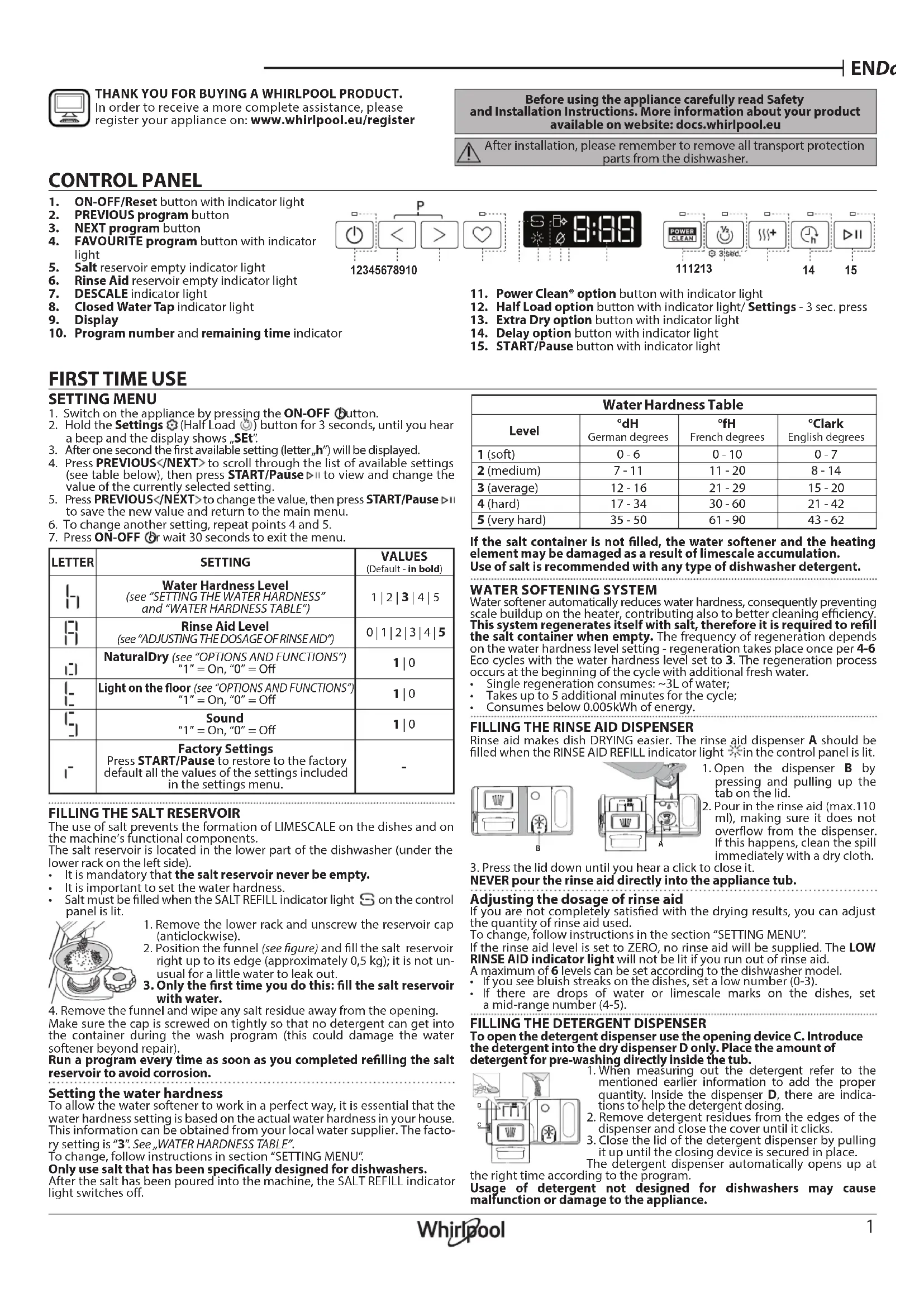 Tableau de dureté de l’eau Niveau °dH Degrés allemand °fH Degrés français °Clark Degrés anglais 1 (très douce) 0 - 6 0 - 10 0 - 7 2 (moyenne) 7 - 11 11 - 20 8 - 14 3 (douce) 12 - 16 21 - 29 15 - 20 4 (dure) 17 - 34 30 - 60 21 - 42 5 (très dure) 35 - 50 61 - 90 43 - 62 W11553946 panelW11572189 button RW11572083 button LW11569647 display