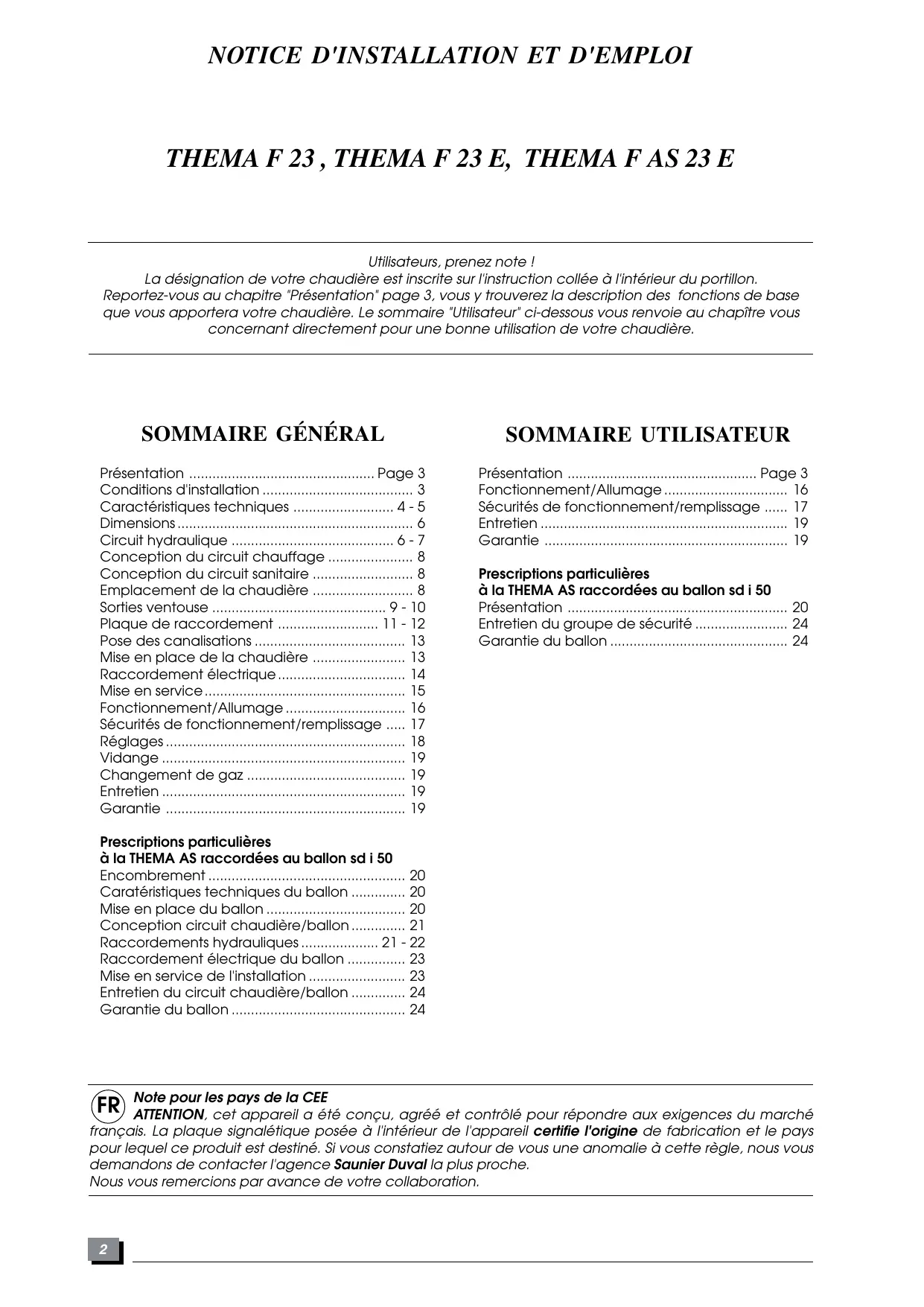 THEMA F 23 , THEMA F 23 E, THEMA F AS 23 E Utilisateurs, prenez note ! La désignation de votre chaudière est inscrite sur l'instruction collée à l'intérieur du portillon. Reportez-vous au chapitre "Présentation" page 3, vous y trouverez la description des fonctions de base que vous apportera votre chaudière. Le sommaire "Utilisateur" ci-dessous vous renvoie au chapître vous concernant directement pour une bonne utilisation de votre chaudière.