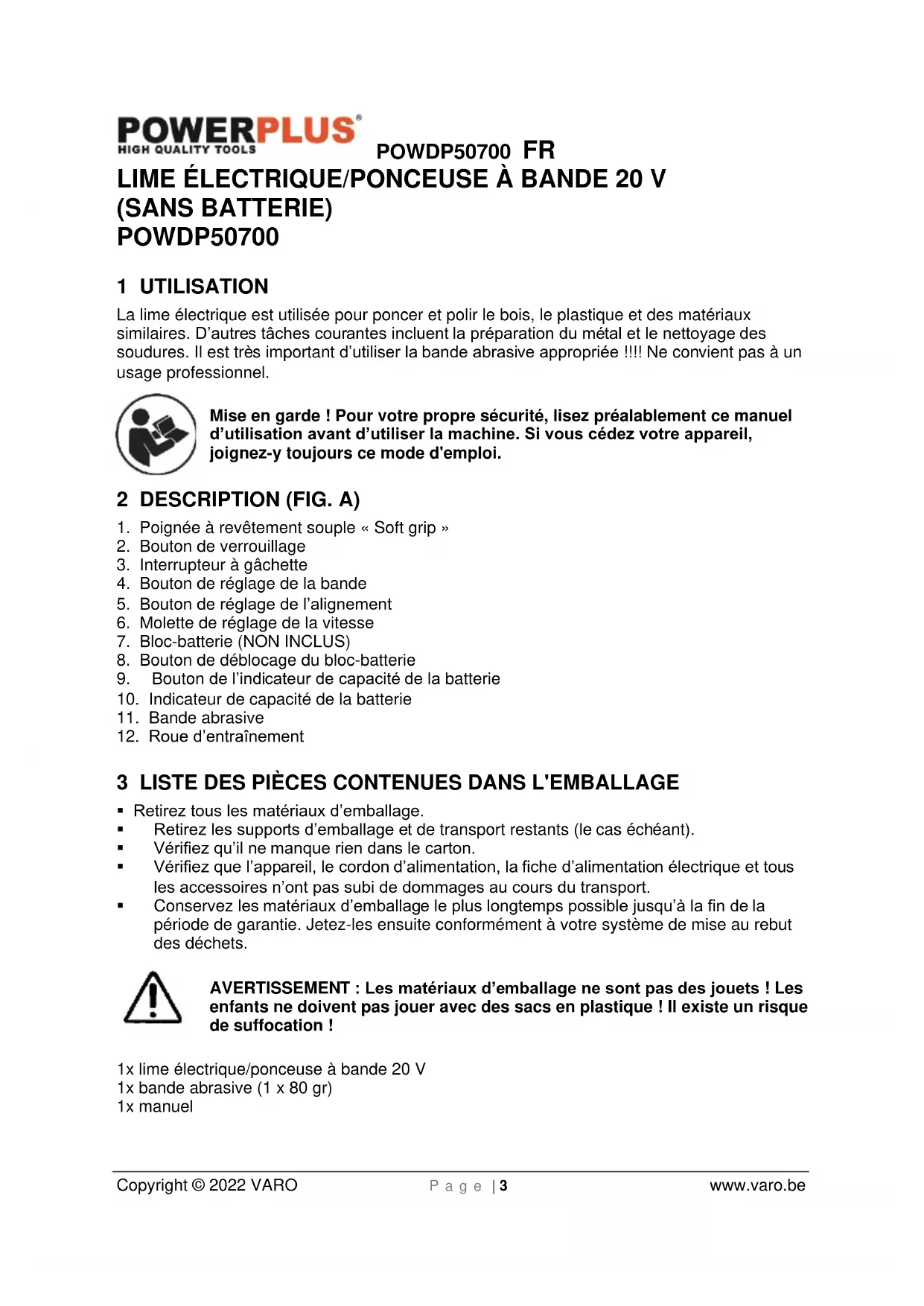 VARO – Vic. Van Rompuy N.V. - Joseph Van Instraat 9 - BE2500 Lier - BELGIQUE, déclare que : Appareil : Lime électrique/ponceuse à bande 20 V – Fonctionnant sur batterie Marque : PowerPlus Modèle : POWDP50700 est en conformité avec les exigences essentielles et les autres dispositions pertinentes des Directives européennes applicables, basées sur l'application des normes européennes harmonisées. Toute modification non autorisée de l'appareil annule cette déclaration. Directives européennes (y compris, le cas échéant, leurs amendements à la date de la signature) : 2011/65/EU 2006/42/EC 2014/30/EU Normes européennes harmonisées (y compris, le cas échéant, leurs amendements à la date de la signature) : EN62841-1 : 2015 EN62841-2-4 : 2014 EN55014-1 : 2017 EN55014-2 : 2015 Détenteur de la Documentation technique : Philippe Vankerkhove, VARO – Vic. Van Rompuy N.V. Le soussigné agit au nom du PDG de l'entreprise, Ludo Mertens Certification Manager 01/10/2021, Lier - BelgiumPOWDP50700 EN Copyright © 2022 VARO P a g e | 1 www.varo.com 1 APPLICATION ...................................................................................... 3