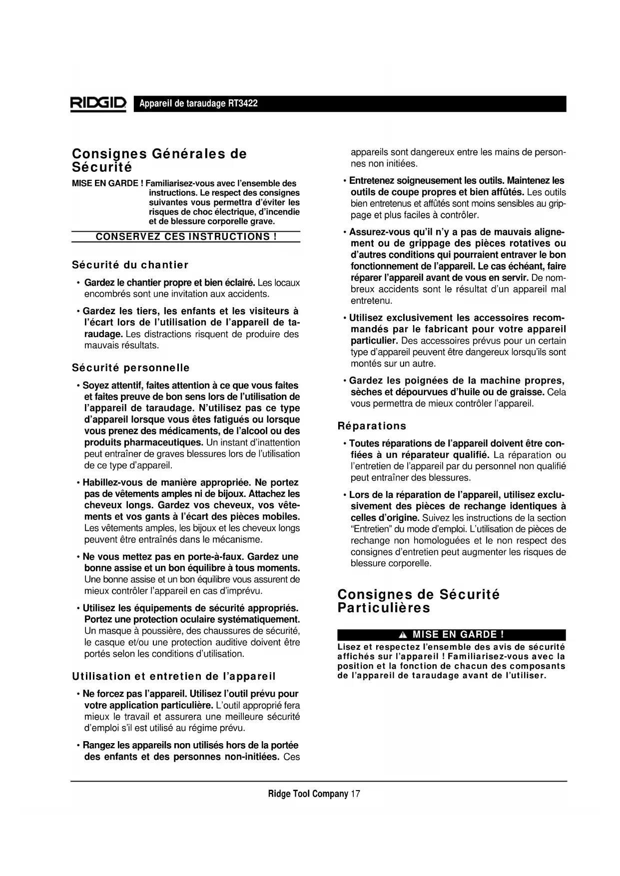 Retrouvez gratuitement la notice de l'appareil RT3422 RIDGID au format PDF.