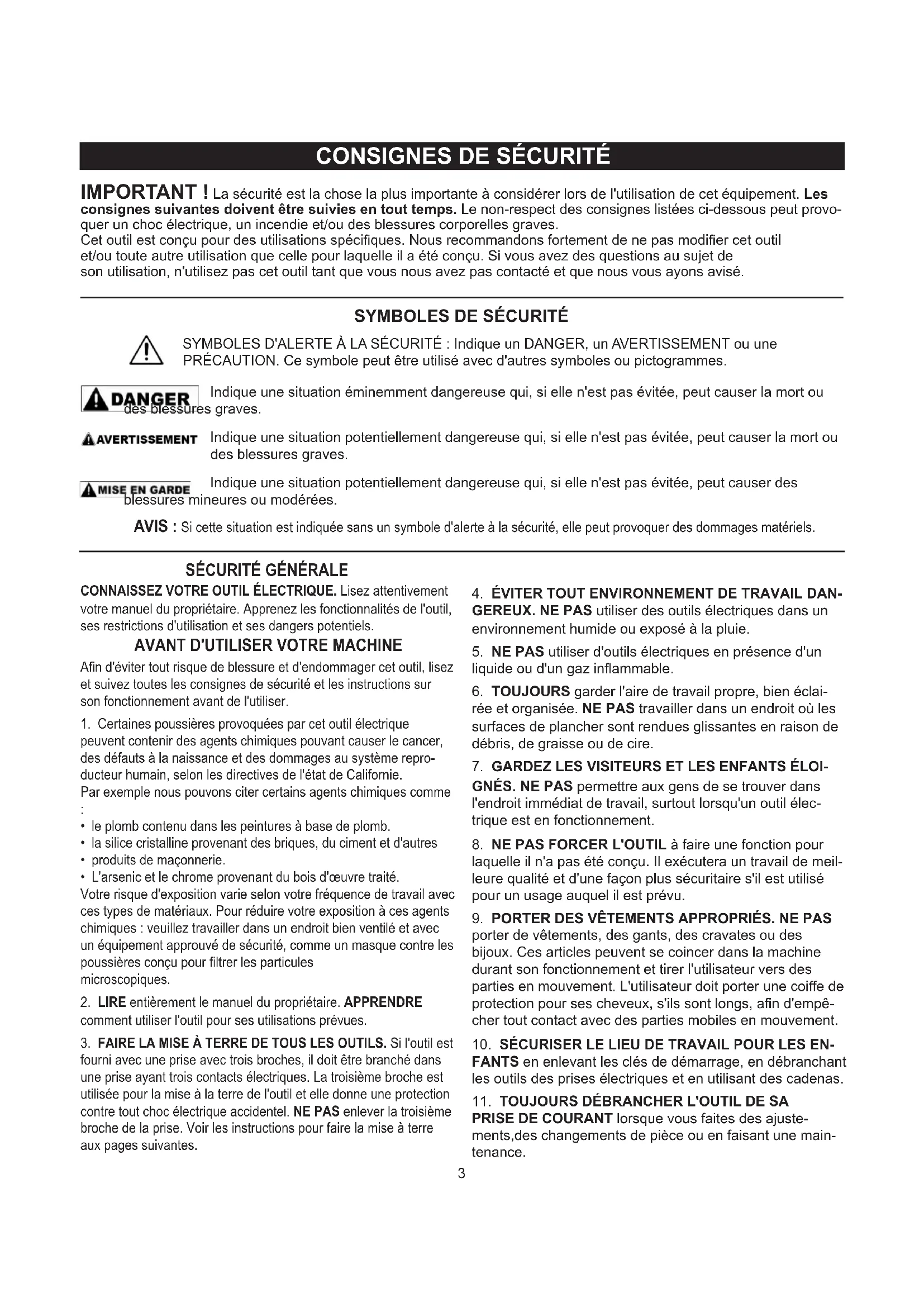 IMPORTANT ! La sécurité est la chose la plus importante à considérer lors de l'utilisation de cet équipement. Les consignes suivantes doivent être suivies en tout temps. Le non-respect des consignes listées ci-dessous peut provo- quer un choc électrique, un incendie et/ou des blessures corporelles graves. Cet outil est conçu pour des utilisations spéciques. Nous recommandons fortement de ne pas modier cet outil et/ou toute autre utilisation que celle pour laquelle il a été conçu. Si vous avez des questions au sujet de son utilisation, n'utilisez pas cet outil tant que vous nous avez pas contacté et que nous vous ayons avisé.