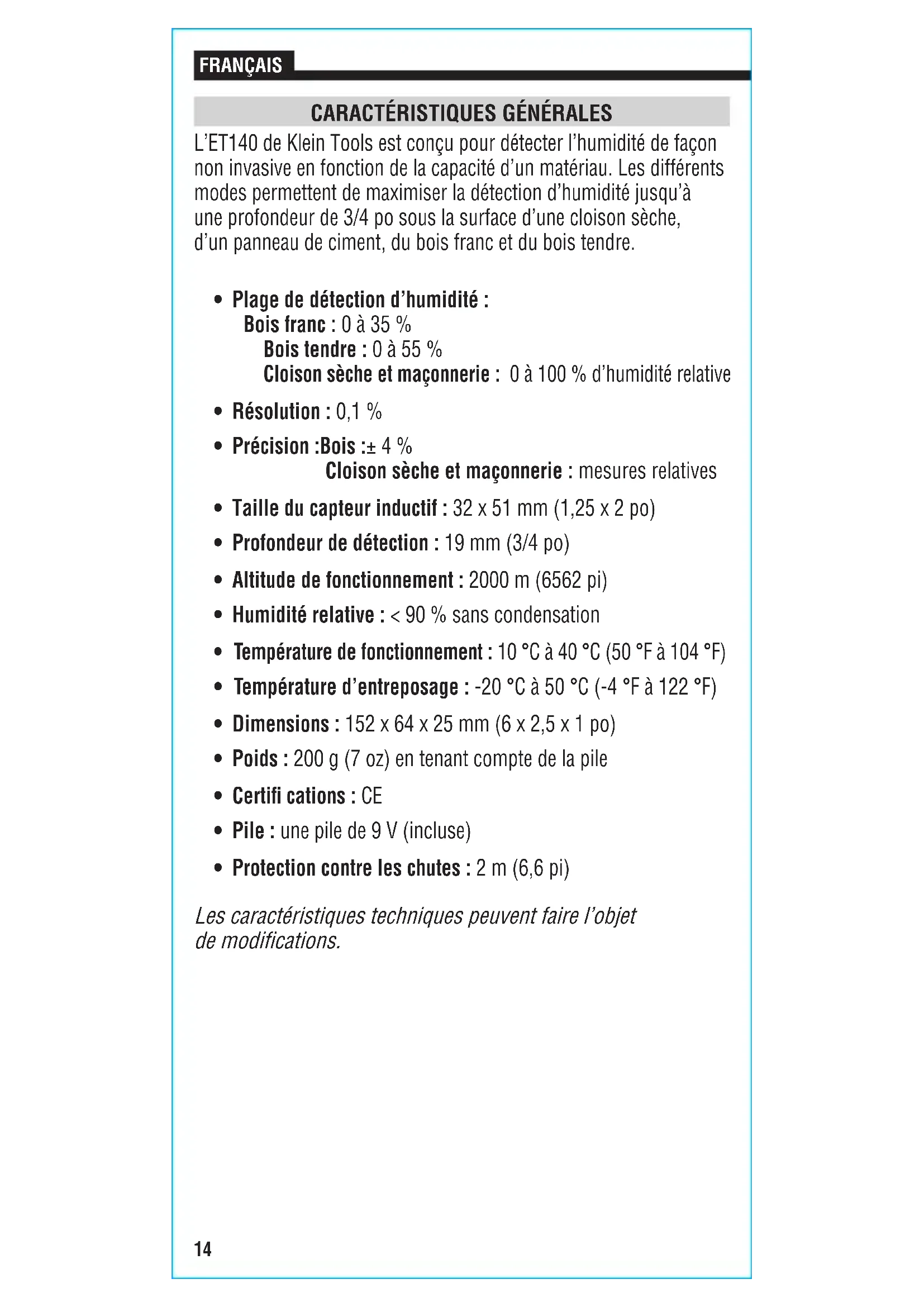- Plage de détection d’humidité: Bois franc: 0 à 35% Bois tendre: 0 à 55% Cloison sèche et maçonnerie: 0 à 100% d’humidité relative