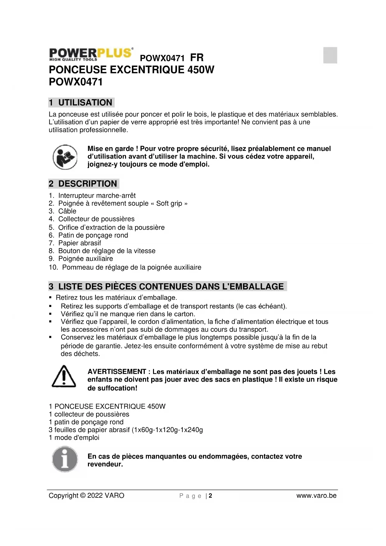 - À la fin du ponçage, retirez la ponceuse de la pièce à travailler avant de la mettre hors tension.POWX0471 FR Copyright © 2022 VARO P a g e | 6 www.varo.be