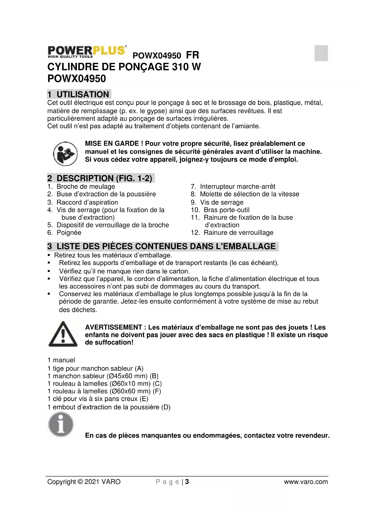 enfants ne doivent pas jouer avec des sacs en plastique ! Il existe un risque de suffocation! 1 manuel 1 tige pour manchon sableur (A) 1 manchon sableur (Ø45x60 mm) (B) 1 rouleau à lamelles (Ø60x10 mm) (C) 1 rouleau à lamelles (Ø60x60 mm) (F) 1 clé pour vis à six pans creux (E) 1 embout d’extraction de la poussière (D) En cas de pièces manquantes ou endommagées, contactez votre revendeur.POWX04950 FR Copyright © 2021 VARO P a g e | 4 www.varo.com 4 PICTOGRAMMES Les symboles suivants sont utilisés dans ce mode d’emploi et/ou sur la machine: