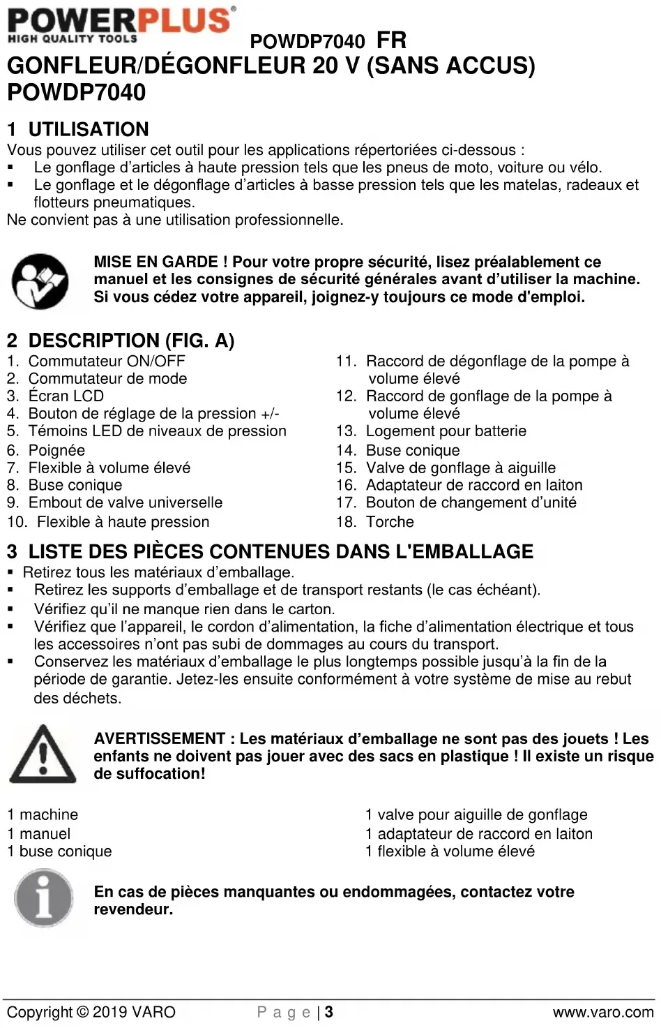 VARO N.V. - Joseph Van Instraat 9 - BE2500 Lier - BELGIQUE, déclare que : Apparei l: GONFLEUR/DÉGONFLEUR 20 V Marque : POWERplus Modèle : POWDP7040 est en conformité avec les exigences essentielles et les autres dispositions pertinentes des Directives européennes applicables, basées sur l'application des normes européennes harmonisées. Toute modification non autorisée de l'appareil annule cette déclaration. Directives européennes (y compris, le cas échéant, leurs amendements à la date de la signature) : 2011/65/EU 2014/30/EU 2006/42/EC Normes européennes harmonisées (y compris, le cas échéant, leurs amendements à la date de la signature) : EN 60204-1:2006 EN 1012-1:2010 EN 60335-1:2012 EN55014-1 : 2017 EN55014-2 : 2015 EN61000-3-2 : 2014 EN61000-3-3 : 2013 Détenteur de la Documentation technique : Philippe Vankerkhove, VARO – Vic. Van Rompuy N.V. Le soussigné agit au nom du PDG de l'entreprise, Hugo Cuypers Certification Manager Lier, 04/01/2019POWDP7040 EN Copyright © 2019 VARO P a g e | 1 www.varo.com 1 APPLICATION ................................................................................ 3