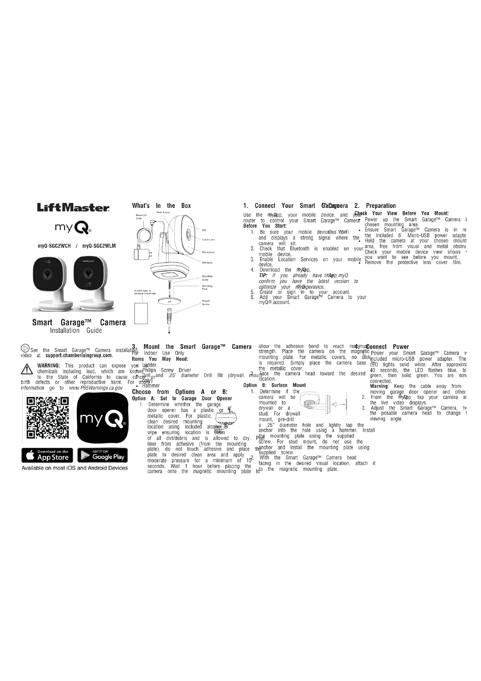 is a registered trademark of Wi-Fi Alliance 114-5836-000myQ-SGC2WCH / myQ-SGC2WLM Caméra Smart Garage™ Guide d’installation Contenu de la boîte Entrée USBMicrophoneObjectif de caméraBouton de réinitialisationCâble Micro USB DEL Plaque de montageVis de montageAncrage pour cloison sècheLingette alcoolisée, pour montage adhésif uniquement