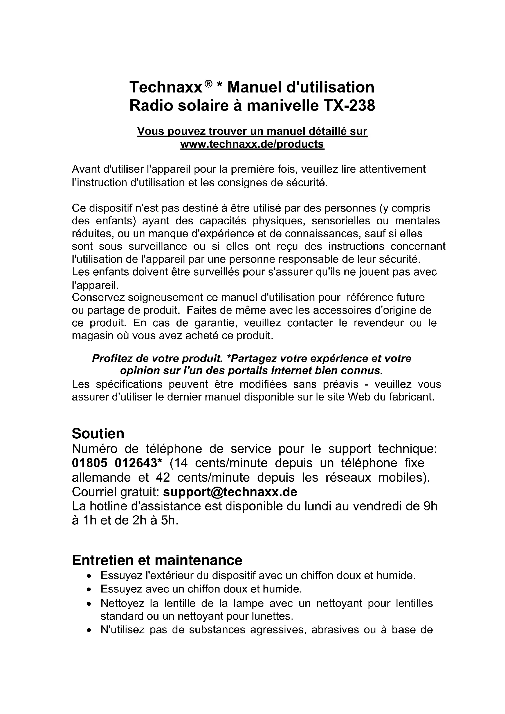 - Manuel d'utilisation Radio solaire à manivelle TX-238 Vous pouvez trouver un manuel détaillé sur www.technaxx.de/products Avant d'utiliser l'appareil pour la première fois, veuillez lire attentivement l’instruction d'utilisation et les consignes de sécurité. Ce dispositif n'est pas destiné à être utilisé par des personnes (y compris des enfants) ayant des capacités physiques, sensorielles ou mentales réduites, ou un manque d'expérience et de connaissances, sauf si elles sont sous surveillance ou si elles ont reçu des instructions concernant l'utilisation de l'appareil par une personne responsable de leur sécurité. Les enfants doivent être surveillés pour s'assurer qu'ils ne jouent pas avec l'appareil. Conservez soigneusement ce manuel d'utilisation pour référence future ou partage de produit. Faites de même avec les accessoires d'origine de ce produit. En cas de garantie, veuillez contacter le revendeur ou le magasin où vous avez acheté ce produit. Profitez de votre produit. *Partagez votre expérience et votre opinion sur l'un des portails Internet bien connus. Les spécifications peuvent être modifiées sans préavis - veuillez vous assurer d'utiliser le dernier manuel disponible sur le site Web du fabricant. Soutien Numéro de téléphone de service pour le support technique: 01805 012643* (14 cents/minute depuis un téléphone fixe allemande et 42 cents/minute depuis les réseaux mobiles). Courriel gratuit: support@technaxx.de La hotline d'assistance est disponible du lundi au vendredi de 9h à 1h et de 2h à 5h. Entretien et maintenance