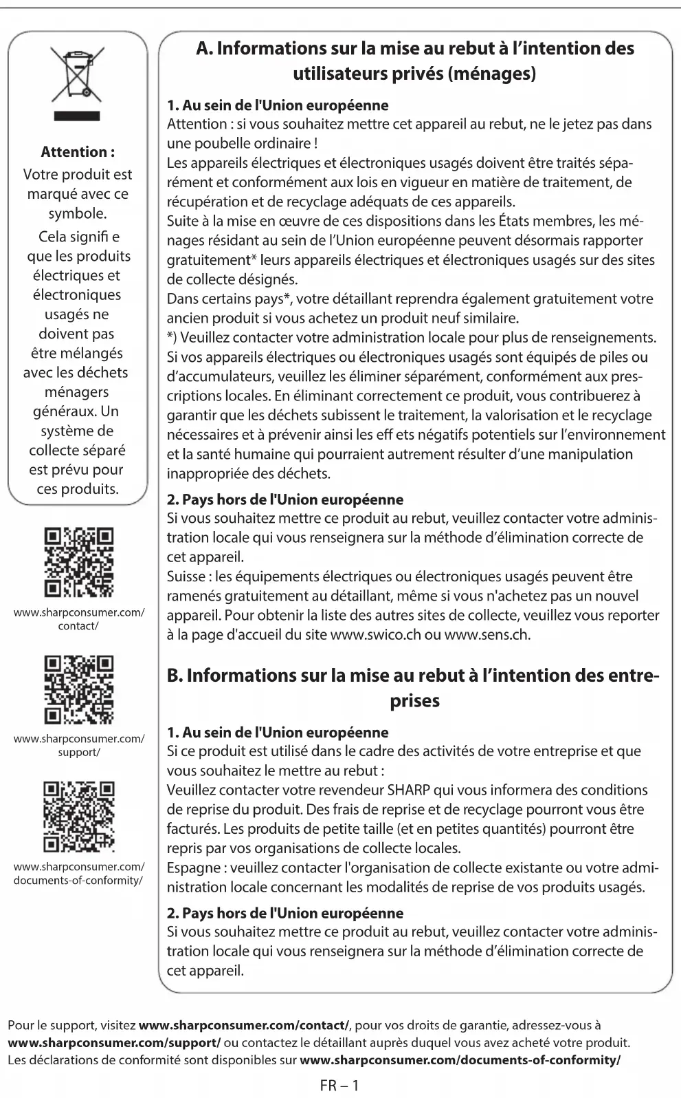 Si vous souhaitez mettre ce produit au rebut, veuillez contacter votre adminis- tration locale qui vous renseignera sur la méthode d’élimination correcte de cet appareil. Attention: Votre produit est marqué avec ce symbole. Cela signi e que les produits électriques et électroniques usagés ne doivent pas être mélangés avec les déchets ménagers généraux. Un système de collecte séparé est prévu pour ces produits. www.sharpconsumer.com/ support/ www.sharpconsumer.com/ documents-of-conformity/ www.sharpconsumer.com/ contact/ Pour le support, visitez www.sharpconsumer.com/contact/, pour vos droits de garantie, adressez-vous à www.sharpconsumer.com/support/ ou contactez le détaillant auprès duquel vous avez acheté votre produit. Les déclarations de conformité sont disponibles sur www.sharpconsumer.com/documents-of-conformity/FR FR – 1FR – 1 A. Informations sur la mise au rebut à l’intention des utilisateurs privés (ménages)