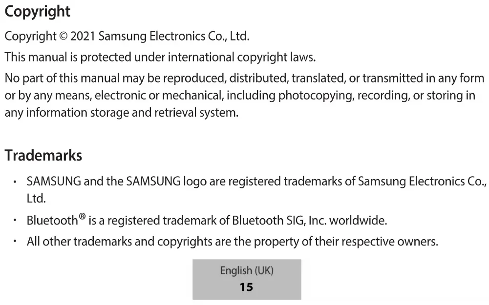 Samsung décline toute responsabilité en cas de dommage (en responsabilité contractuelle ou délictuelle, y compris en cas de négligence) pouvant provenir du non-respect de ces avertissements et instructions, excepté en cas de décès ou de blessures corporelles causés par une négligence de la part de Samsung. Français 14Droits d’auteur Copyright © 2021 Samsung Electronics Co., Ltd. Ce mode d’emploi est protégé par les lois internationales sur les droits d’auteur. Il est interdit de reproduire, distribuer, traduire ou transmettre sous quelque forme et par quelque moyen que ce soit, électronique ou mécanique, notamment par photocopie, enregistrement ou stockage dans un système de stockage et de recherche documentaire, tout ou partie de ce document. Marques