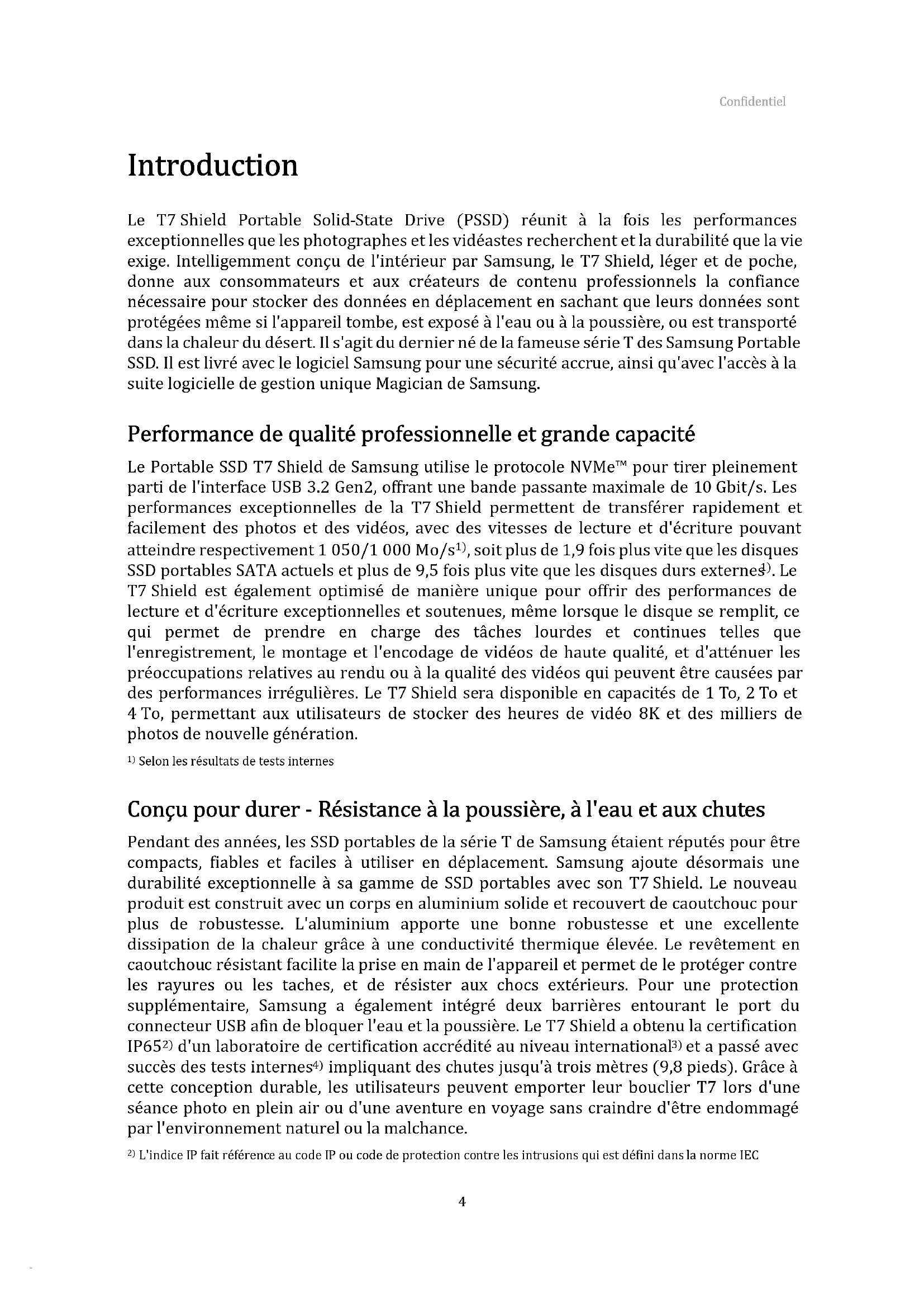 - SAMSUNG ELECTRONICS CO., LTD. SE RÉSERVE LE DROIT DE MODIFIER À TOUT MOMENT DES PRODUITS, DES INFORMATIONS ET DES SPÉCIFICATIONS SANS NOTIFICATION. Les informations contenues dans le présent document concernent les produits de Samsung Electronics Co., Ltd. ("Samsung"). Les descriptions et spécifications de produits contenues dans le présent document sont mentionnées ici à des fins de référence uniquement. Toutes les informations contenues dans le présent document peuvent être modifiées à tout moment, sans notification, et sont fournies "EN L'ÉTAT", sans garantie quelconque. Ce document et les informations contenues dans le présent document demeurent la propriété unique et exclusive de Samsung. Aucune licence, aucun brevet, copyright, travail de masque, marque commerciale ou autre droit de propriété intellectuelle n'est accordé par le présent document, de manière expresse ou implicite, par préclusion ou autre. Sauf disposition des conditions de vente de Samsung concernant ces produits, Samsung rejette expressément toute garantie, expresse ou implicite, concernant la vente et/ou l'utilisation des produits Samsung, y compris la responsabilité ou les garanties liées à l'adéquation à un usage particulier, à la qualité marchande ou à l'infraction d'un brevet, d'un copyright ou de tout autre droit de propriété intellectuelle. Les produits Samsung ne sont pas conçus pour être utilisés avec des équipements de soutien vital, soins intensifs, médicaux, de sécurité ou autres applications avec lesquelles une défaillance du produit pourrait entraîner la perte de la vie, des dommages personnels ou physiques, voire avec des applications militaires, de défense ou gouvernementales auxquelles des conditions ou des dispositions spéciales pourraient être applicables. Pour obtenir des mises à jour ou des informations supplémentaires sur des produits Samsung, contactez votre boutique Samsung locale ou consultez le site web Samsung (https://www.samsung.com ). Samsung et les logos Samsung sont des marques déposées de Samsung Electronics Co., Ltd. ou de ses sociétés affiliées aux États-Unis ou dans d'autres pays. Les autres noms et marques sont la propriété de leurs détenteurs respectifs. Copyright © 2022, Samsung Electronics Co., Ltd. Tous droits réservés.3 Confidentiel Samsung Portable SSD T7 Shield Manuel d'utilisation Table des matières Introduction p. 4