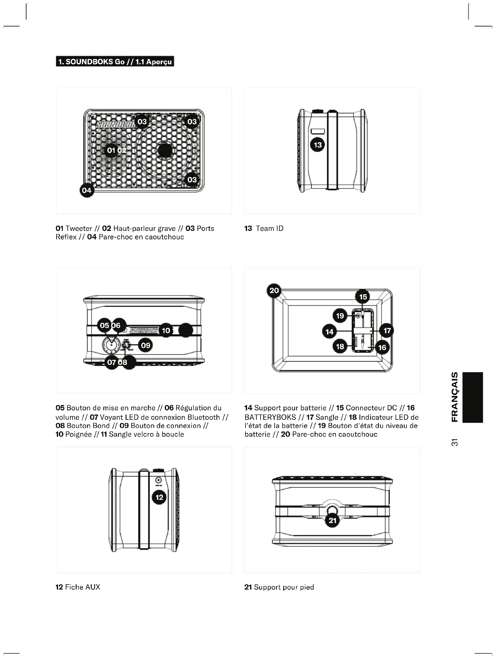 33BATTERYBOKS & CHARGEUR2.31 FRANÇAIS 14 Support pour batterie // 15 Connecteur DC // 16 BATTERYBOKS // 17 Sangle // 18 Indicateur LED de l’état de la batterie // 19 Bouton d’état du niveau de batterie // 20 Pare-choc en caoutchouc 05 Bouton de mise en marche // 06 Régulation du volume // 07 Voyant LED de connexion Bluetooth // 08 Bouton Bond // 09 Bouton de connexion // 10 Poignée // 11 Sangle velcro à boucle 12 Fiche AUX 01 Tweeter // 02 Haut-parleur grave // 03 Ports Reflex // 04 Pare-choc en caoutchouc